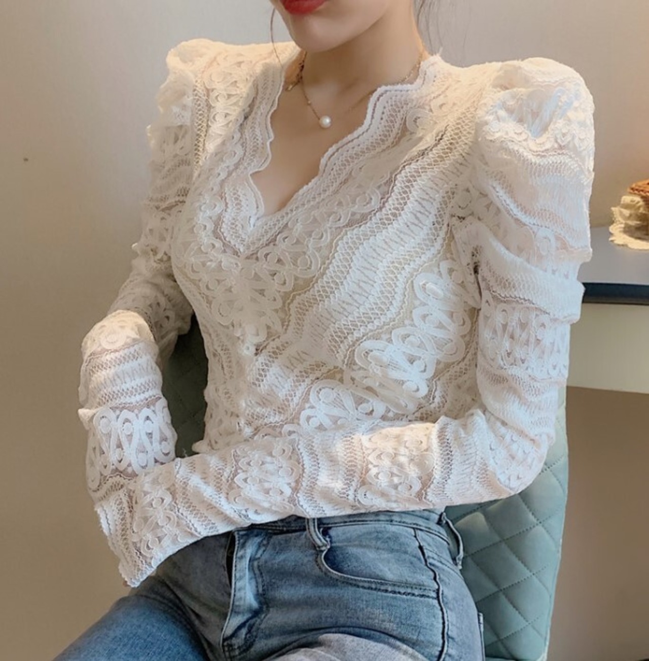 シャツ プルオーバー トップス レース レディース 透け感 Vネック フリル セクシー 華やか 長袖 ホワイト ab2765
