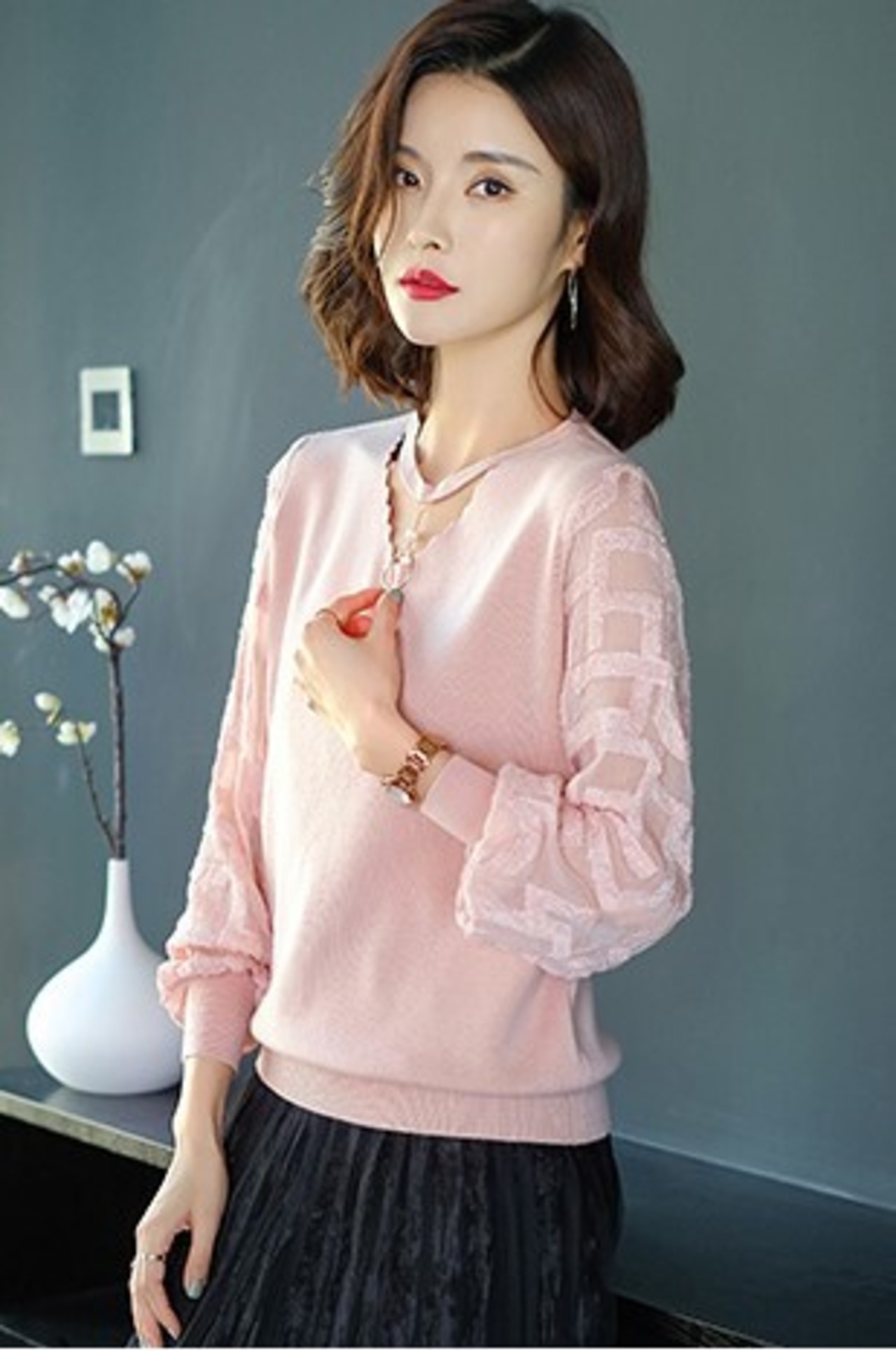 トップス プルオーバー シャツ ニット Vネック レディース 異素材ミックス 秋冬 オフィス 長袖 ママコーデ ピンク ab2767