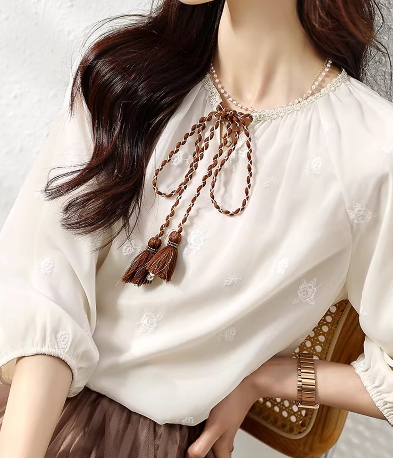 トップス プルオーバー レディース 五分袖 春秋 ボヘミアン ラウンドネック リボン エスニック 花刺繍 ガーリー オフィス ab2786
