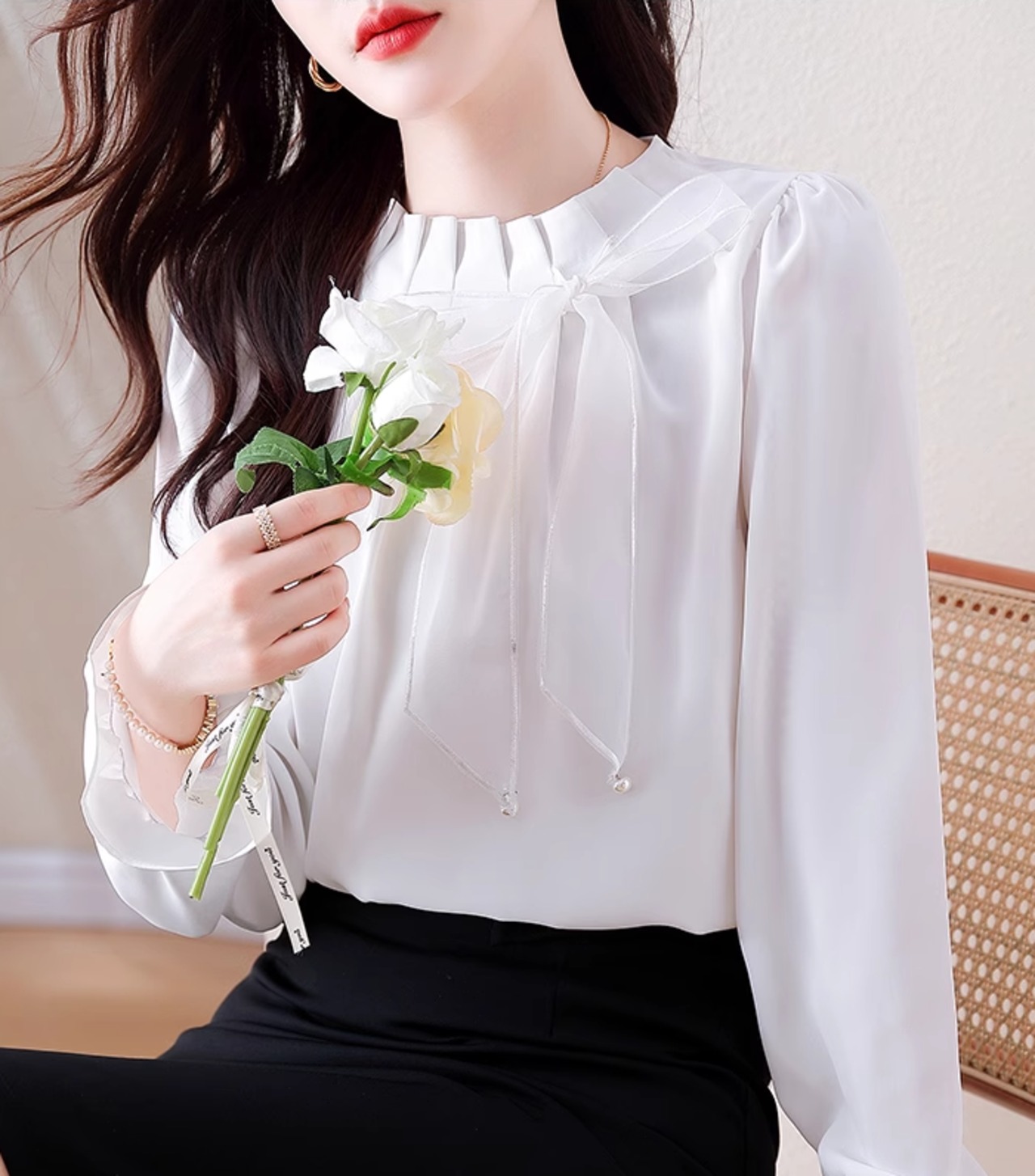 トップス シャツ シフォンシャツ レディース 長袖 オールシーズン フリル リボン フェミニン プルオーバー ガーリー オフィス ホワイト ab2788