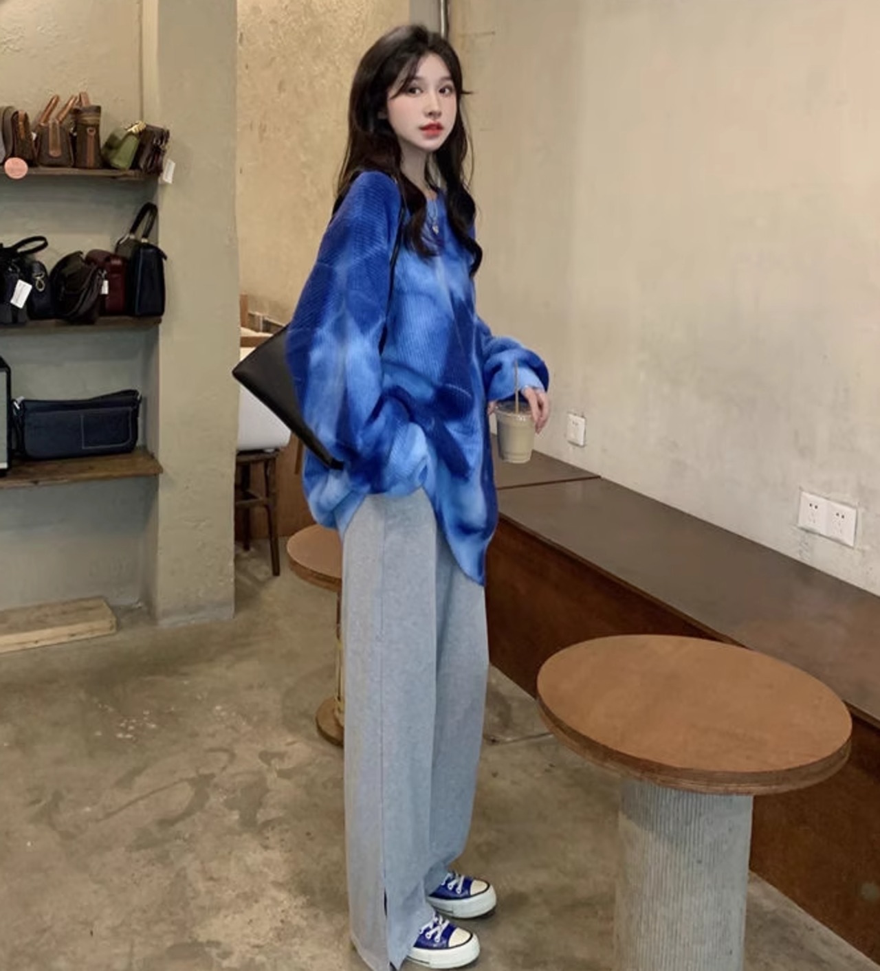 セーター ニット レディース カジュアル 秋冬 ゆったり ラウンドネック 長袖 マーブル プチプラ ブルー ab2806