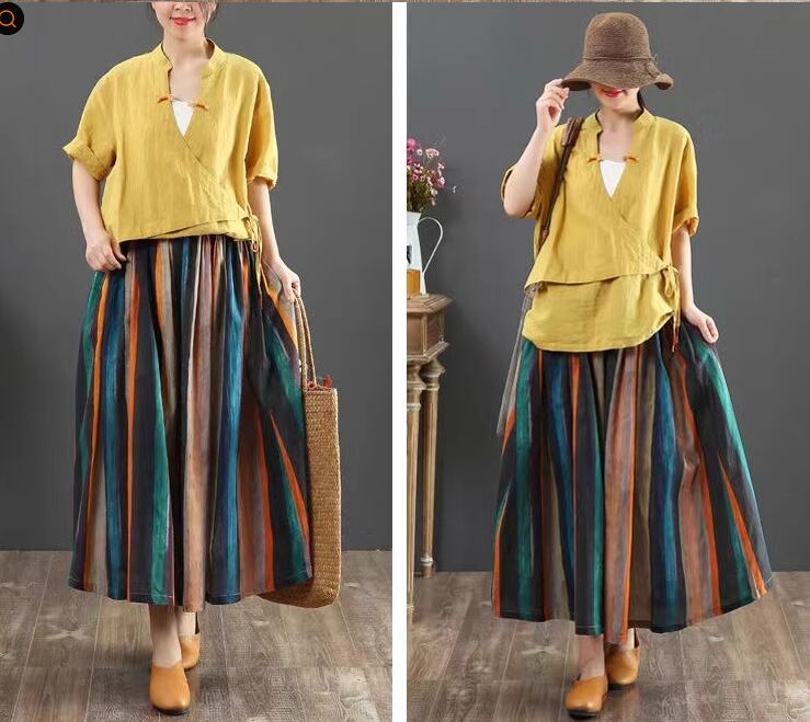 スカート レディース ロング丈 秋冬 Aライン プリーツ レトロ シック ストライプ ボーダー ふんわり カジュアル ガーリー ab2824