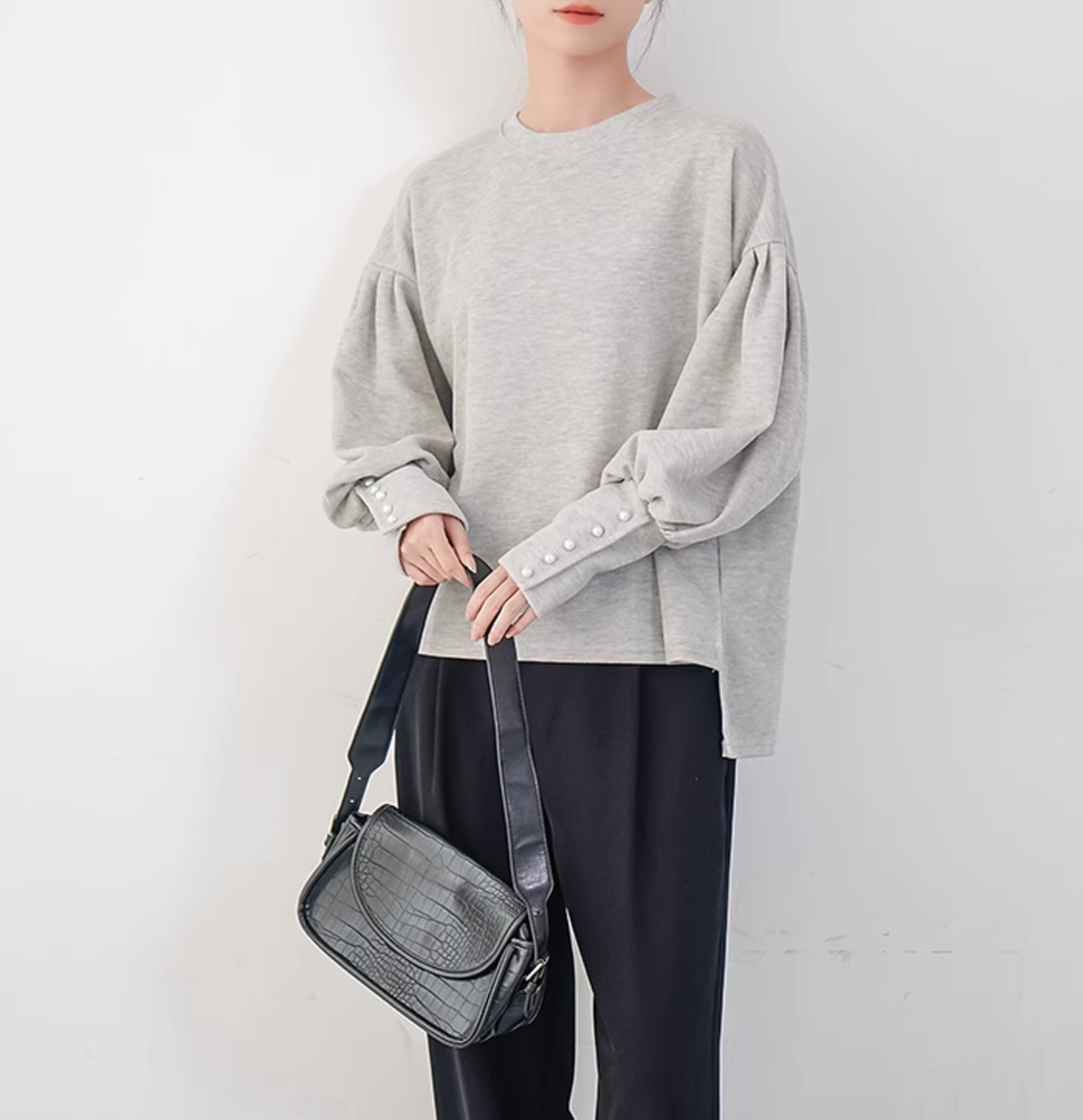 プルオーバー トップス 秋冬 レディース ランタンスリーブ 無地 ラウンドネック シンプル ボタン オフィス アシンメトリー ライトグレー ab2846