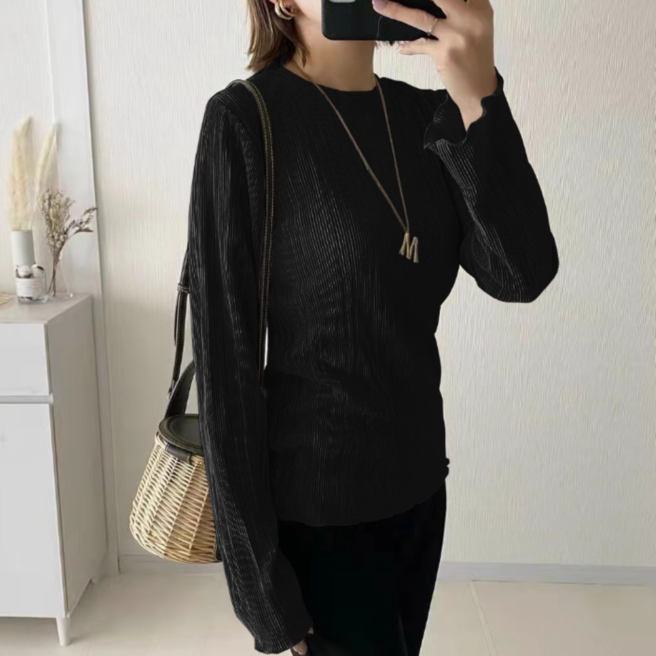 トップス プルオーバー レディース 秋冬 長袖 ラウンドネック プリーツ フリル ガーリー オフィス プチプラ ブラック ab2847