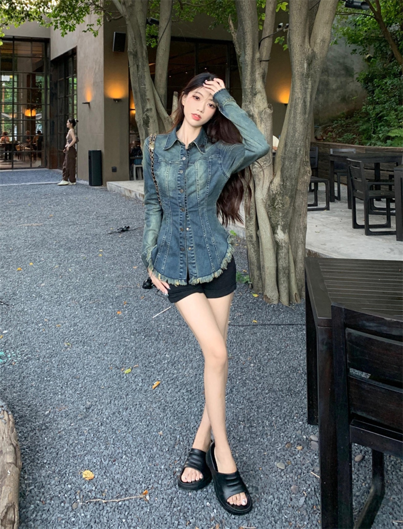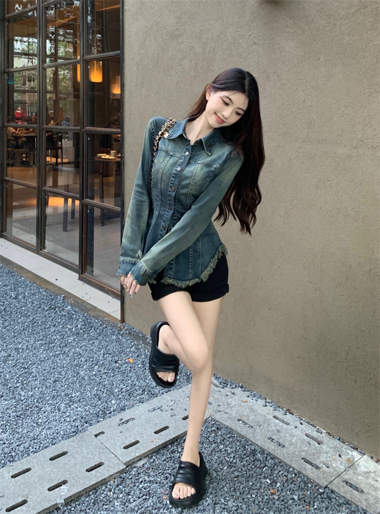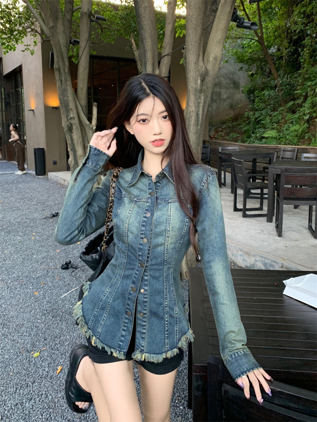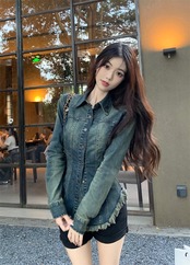 スリムデニムシャツ トップス レディース 長袖 デニム スリム シャツ 秋 カジュアル スリムフィット スタイルアップ MH3814