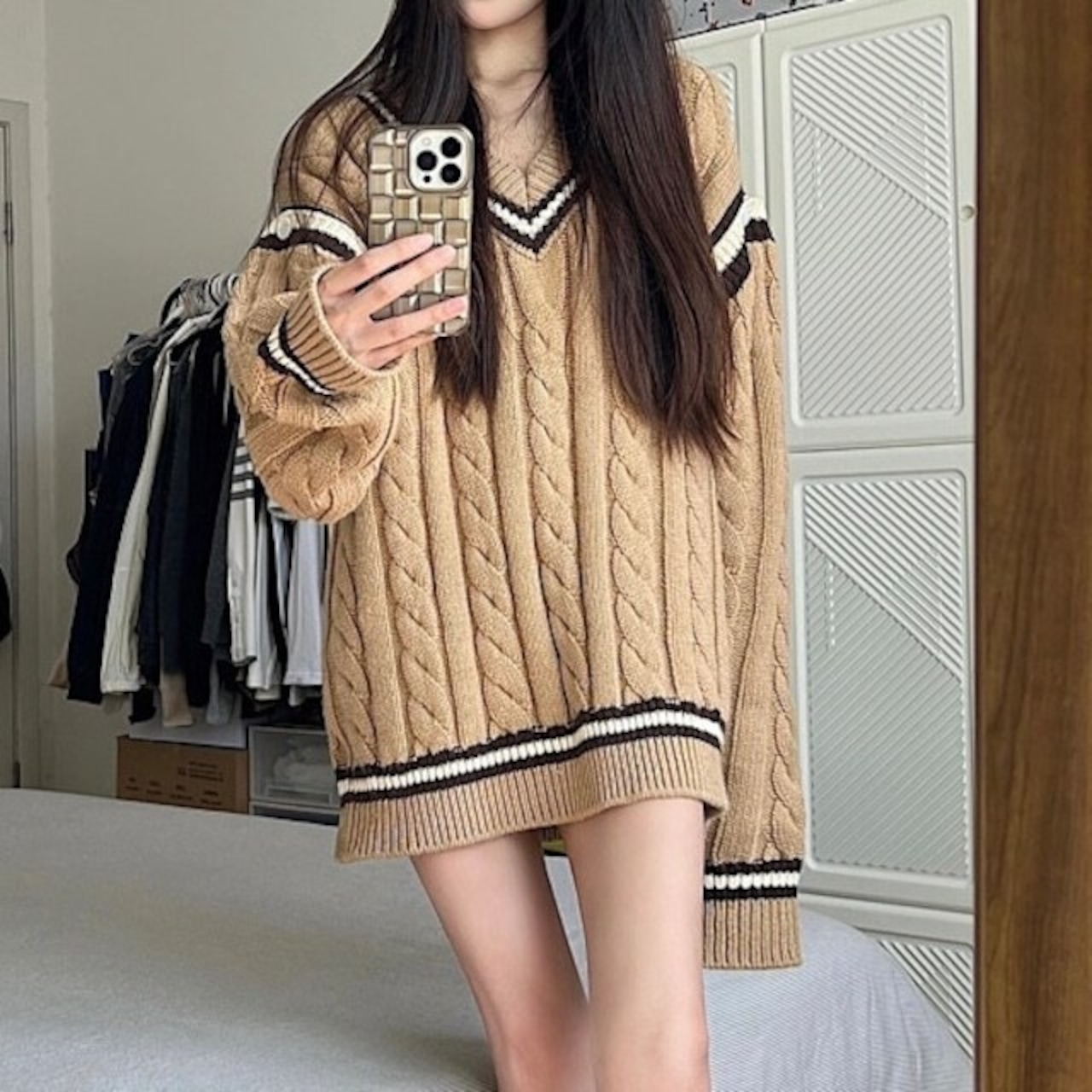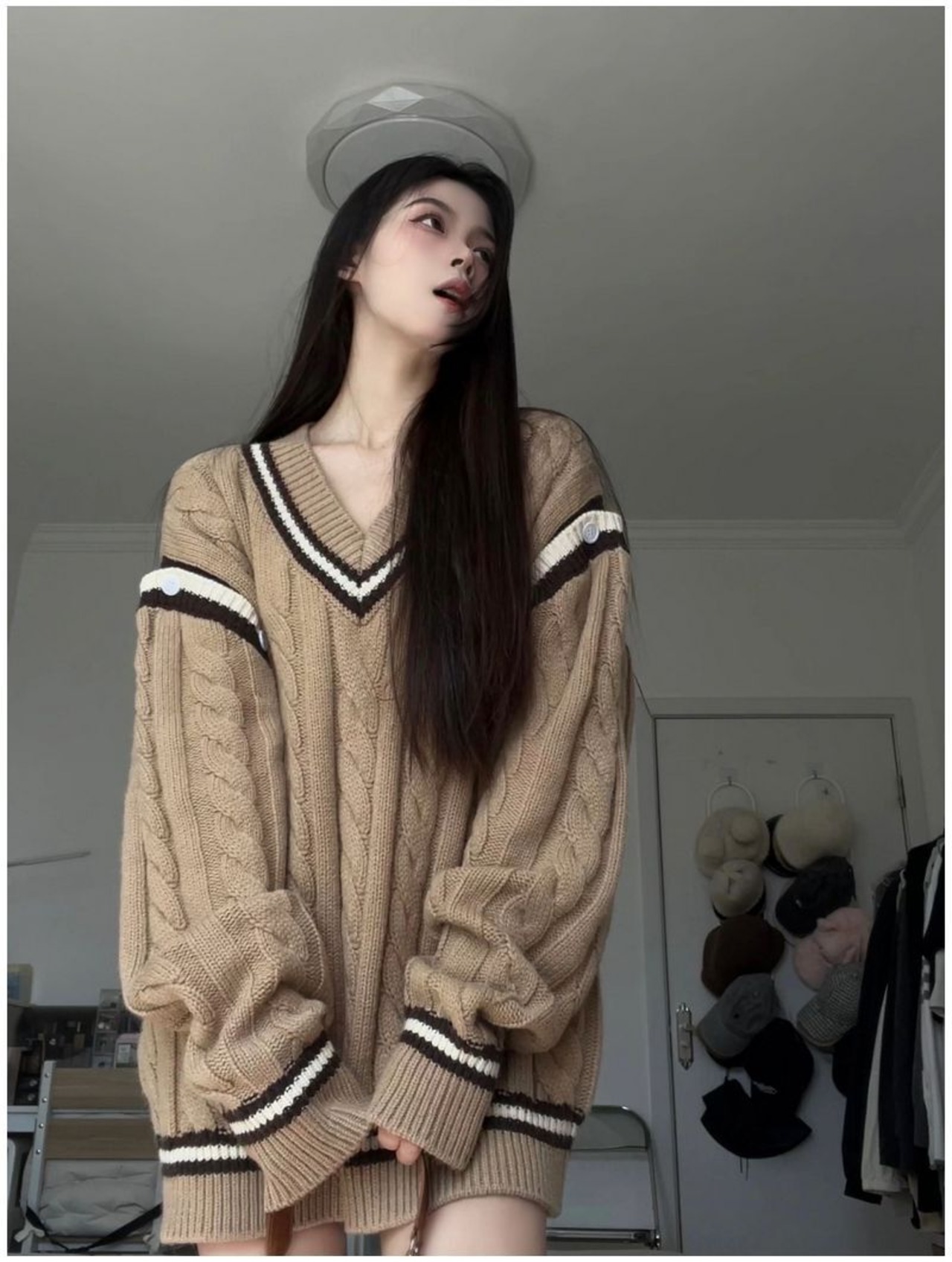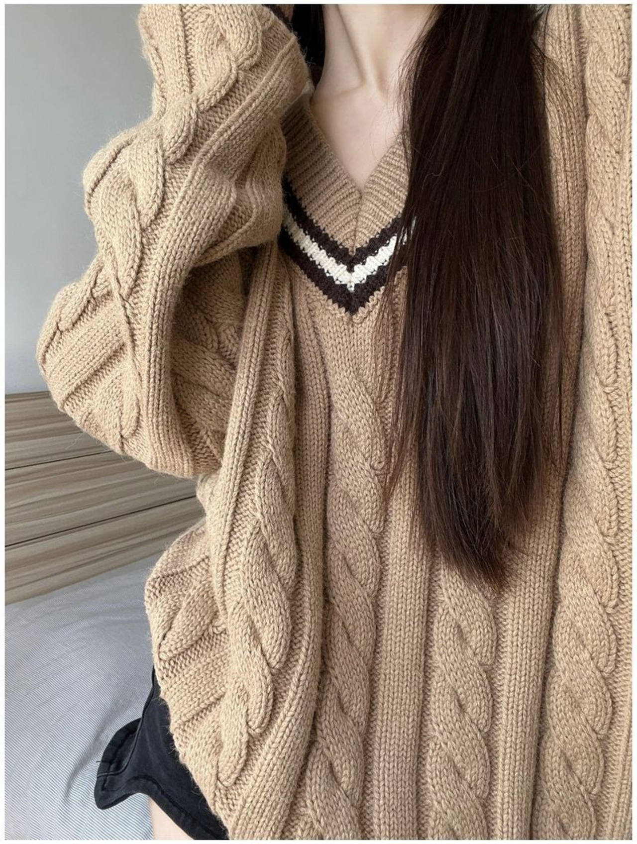 Vネックのニットトップス。