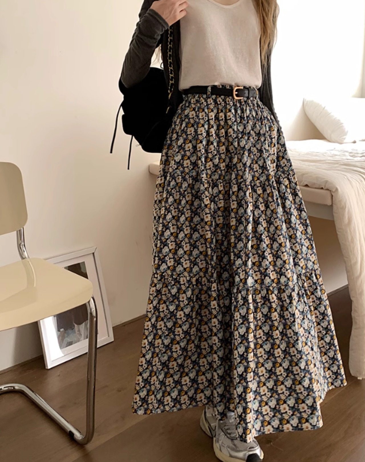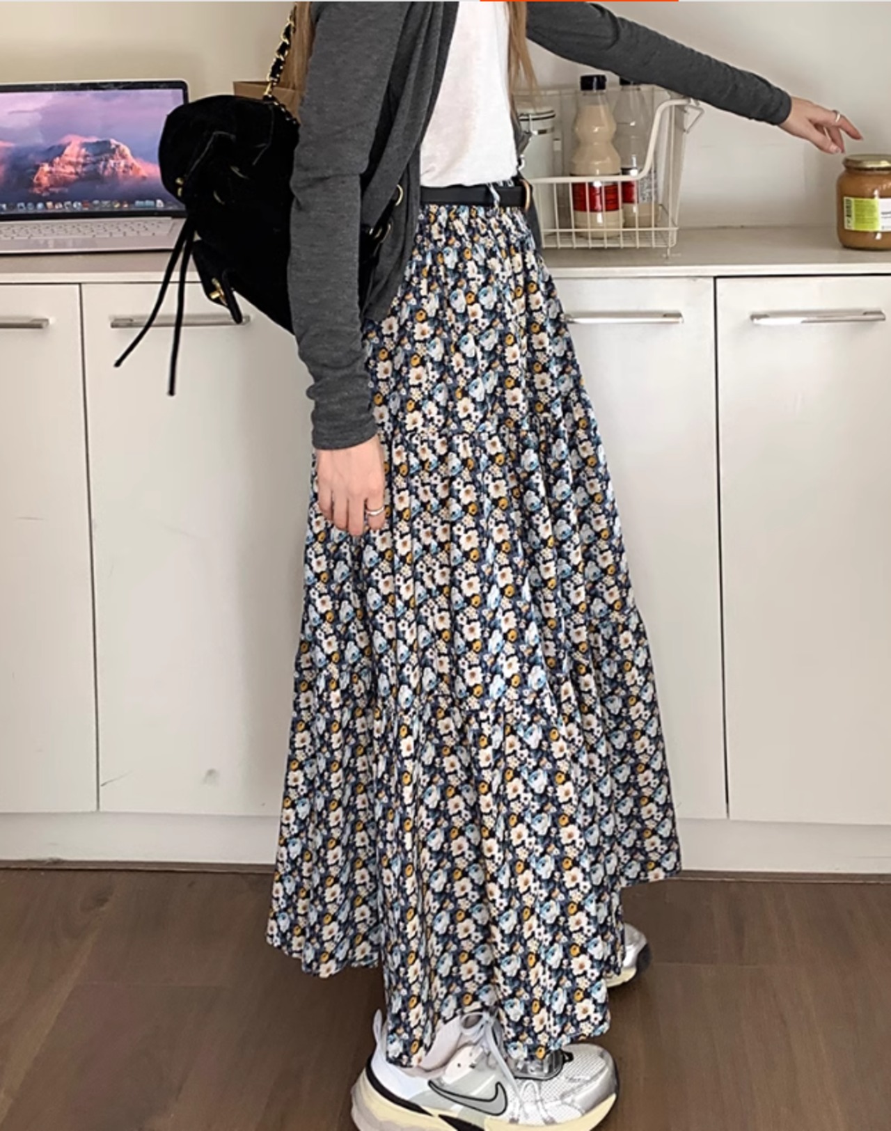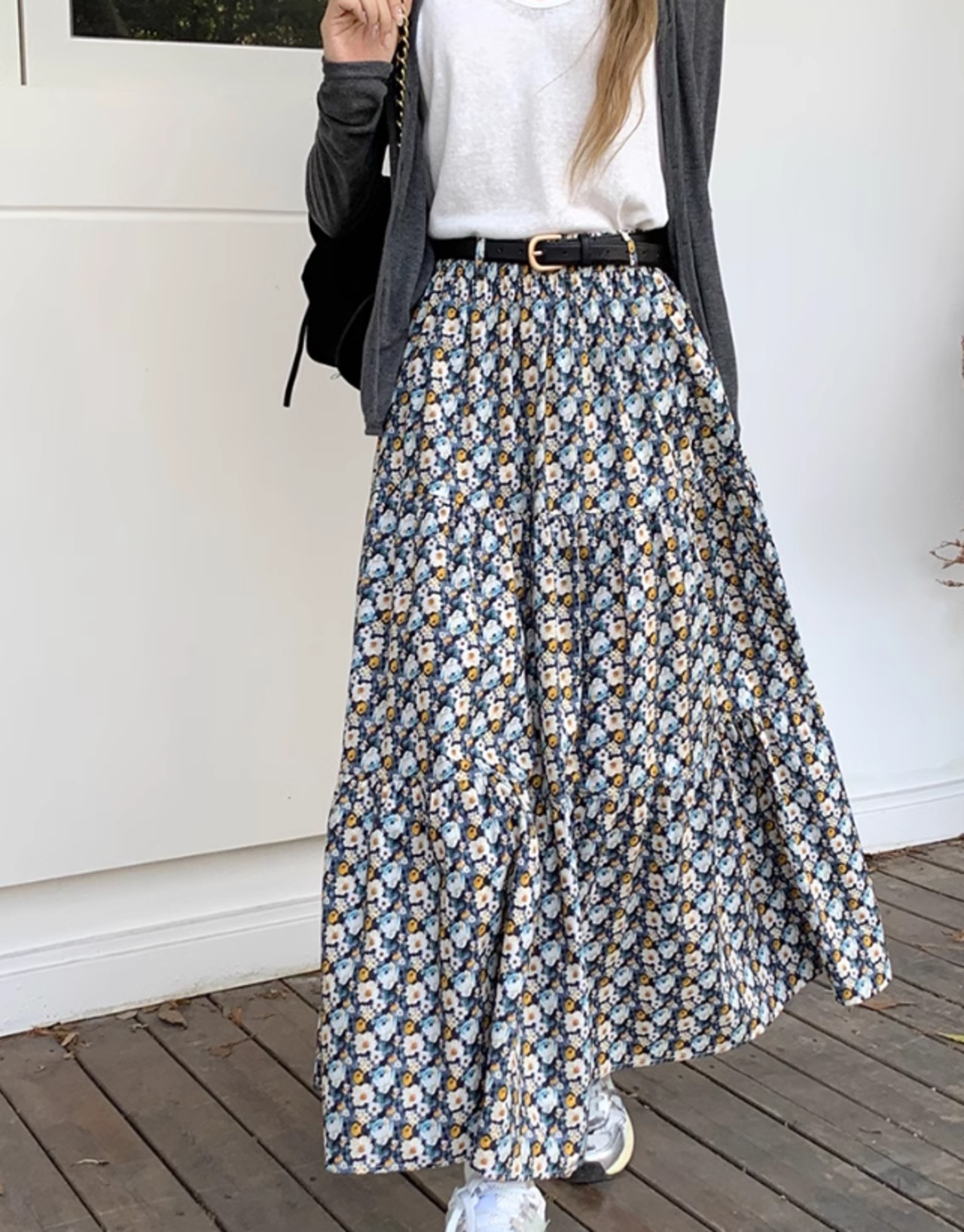 スカート ロングスカート レディース 秋冬 Aライン フリルスカート ハイウエスト 花柄 小花 ふんわり ロング丈 体型カバー ガーリー ネイビー ab2860