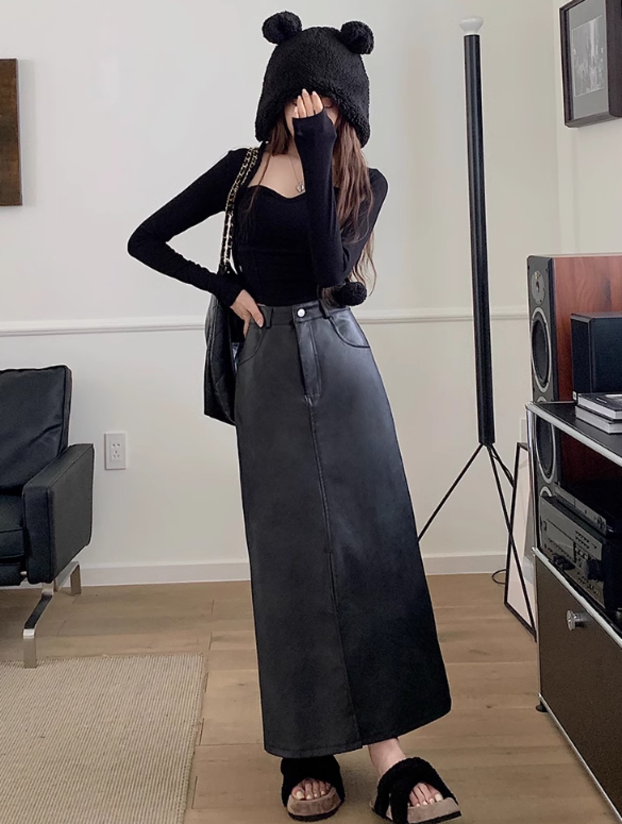 スカート レザースカート レディース 秋冬 ロング丈 レザー ハイウエスト Aライン クール カッコ可愛い カジュアル ブラック ab2866