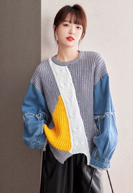セーター ニット ドッキング デニム 異素材MIX レディース 秋冬 ラウンドネック 長袖 ゆったり カジュアル プチプラ ab2880