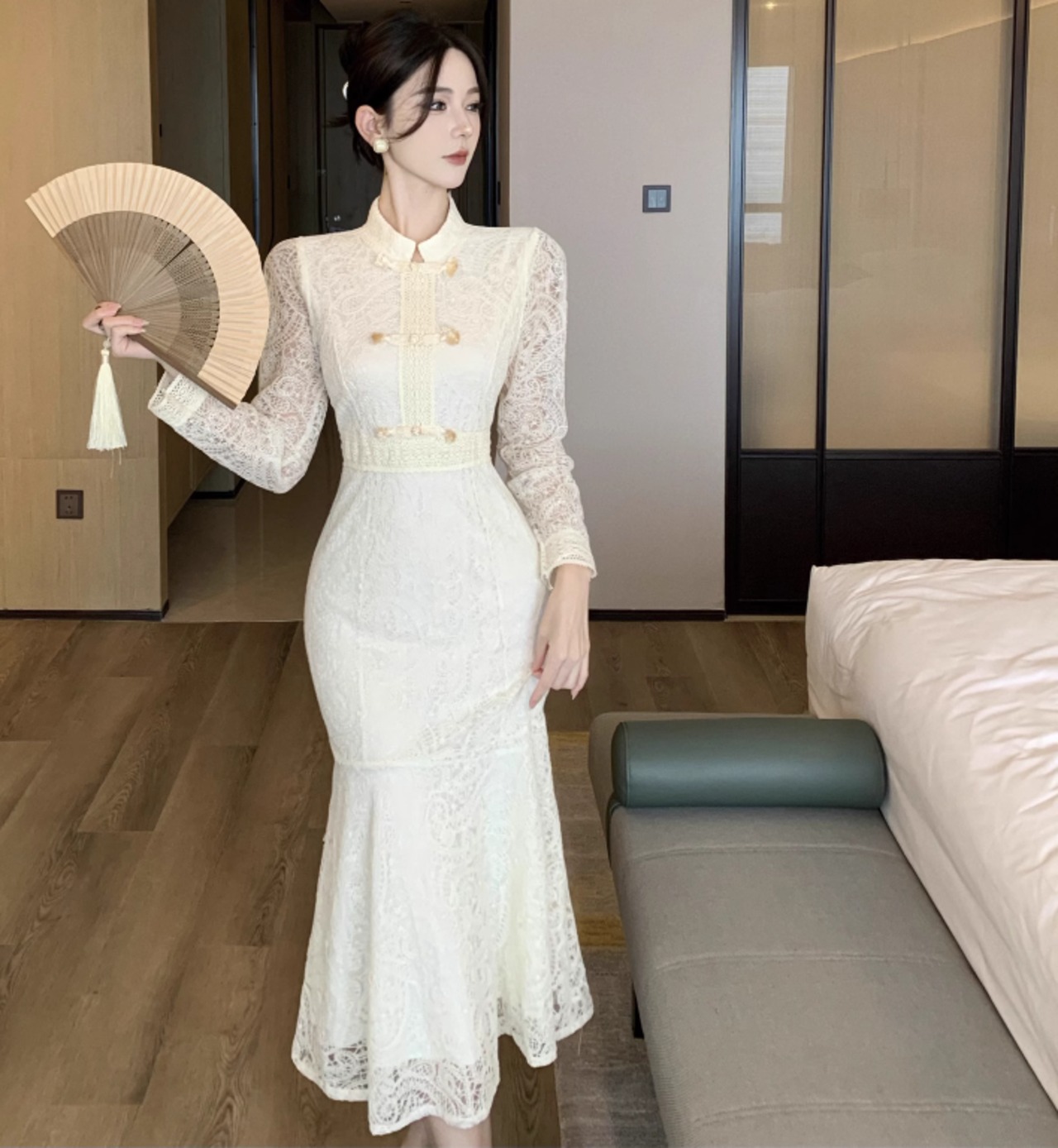ワンピースドレス ドレス チャイナドレス マーメイド チャイナ レディース 長袖 結婚式 二次会 パーティー レース フィッシュテール アプリコット ab2885