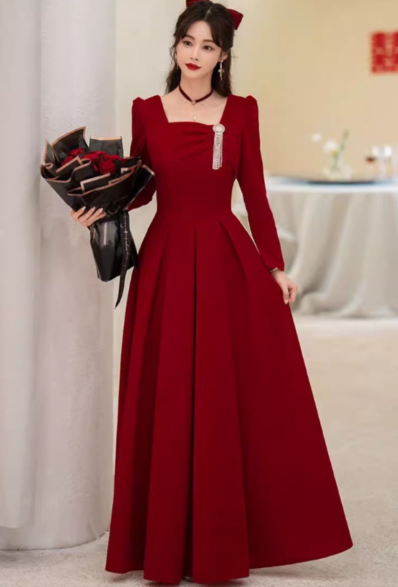 ドレス ワンピースドレス ワンピース レディース ロング丈 スクエアネック 長袖 無地 Aライン エレガント パーティー 二次会 結婚式 ab2890