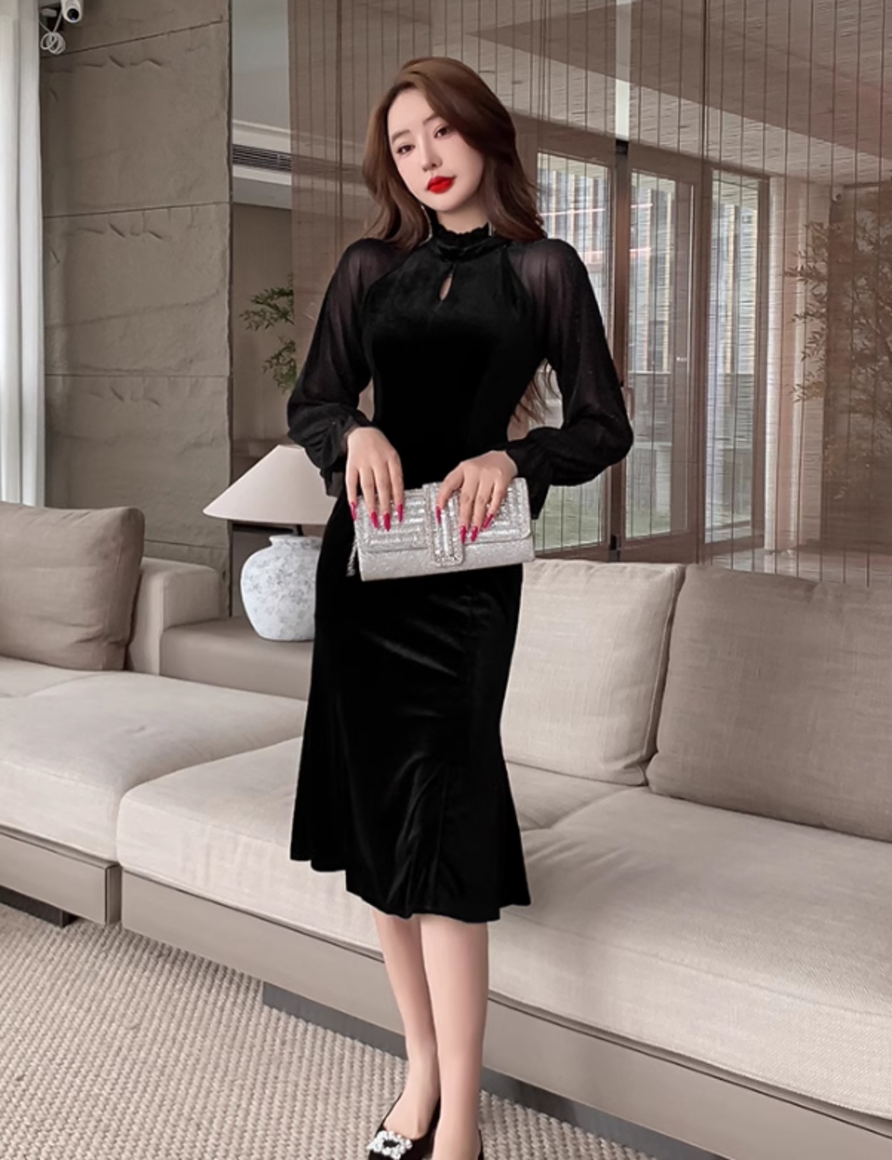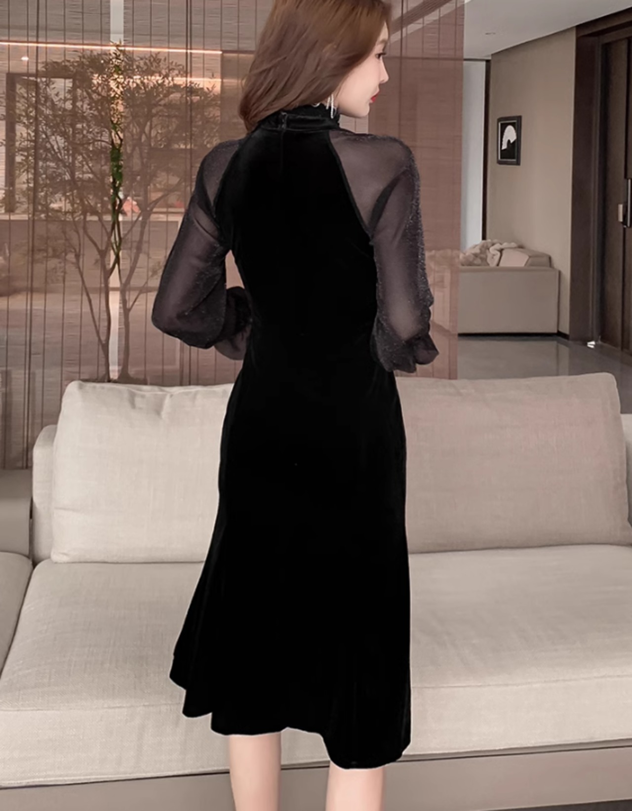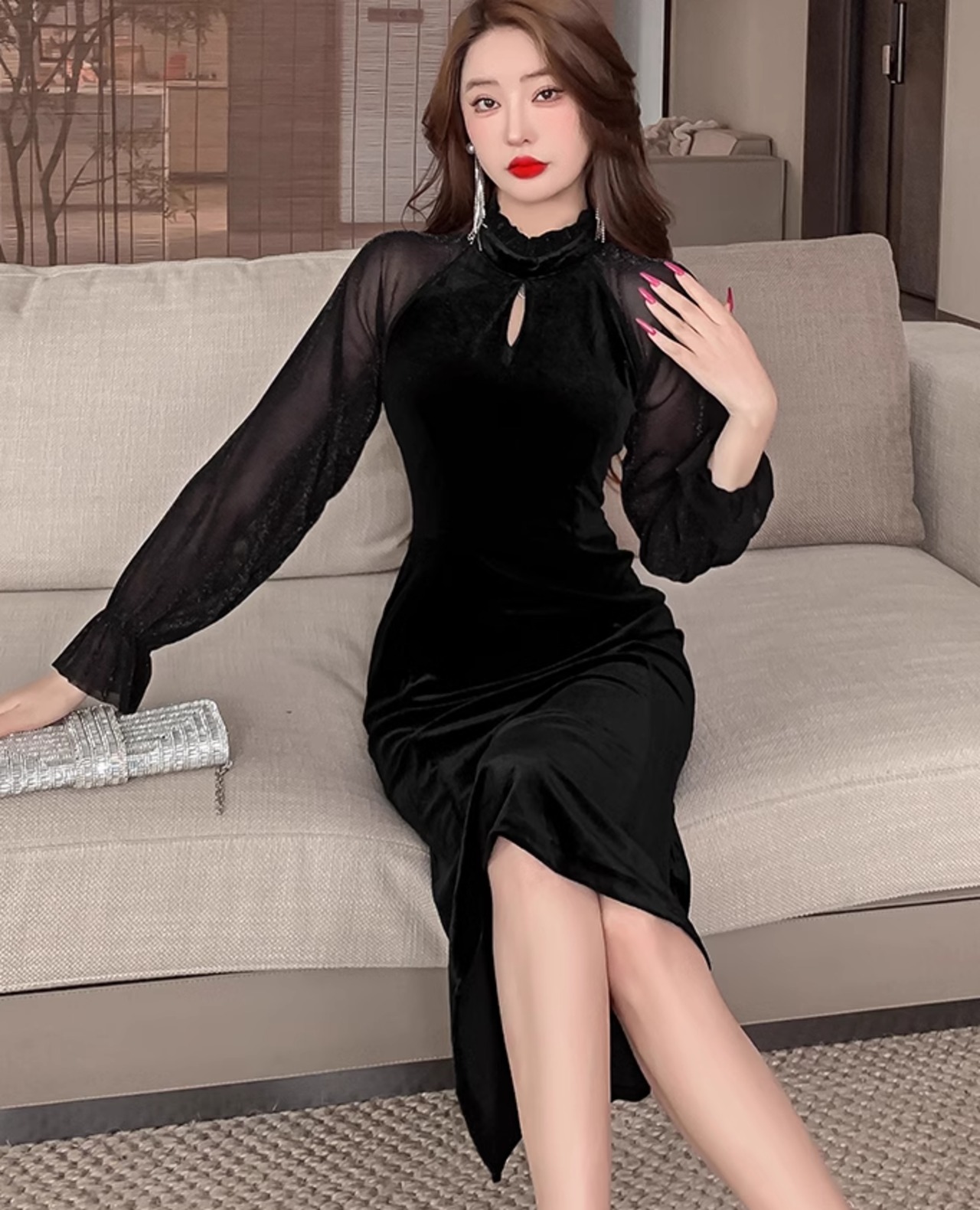 ワンピース ドレス ワンピースドレス イブニングドレス レディース 秋冬 ベルベット 透け感 長袖 ハイネック パーティー ひざ丈 ab2896