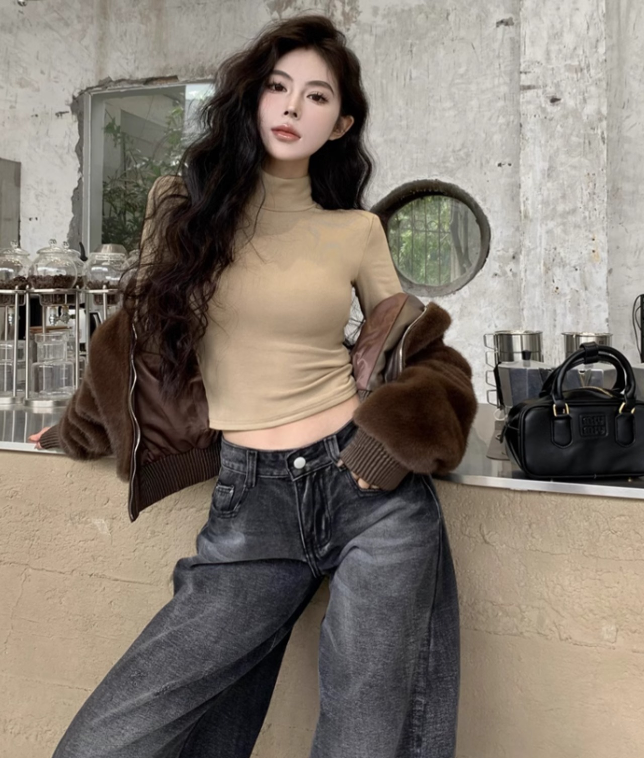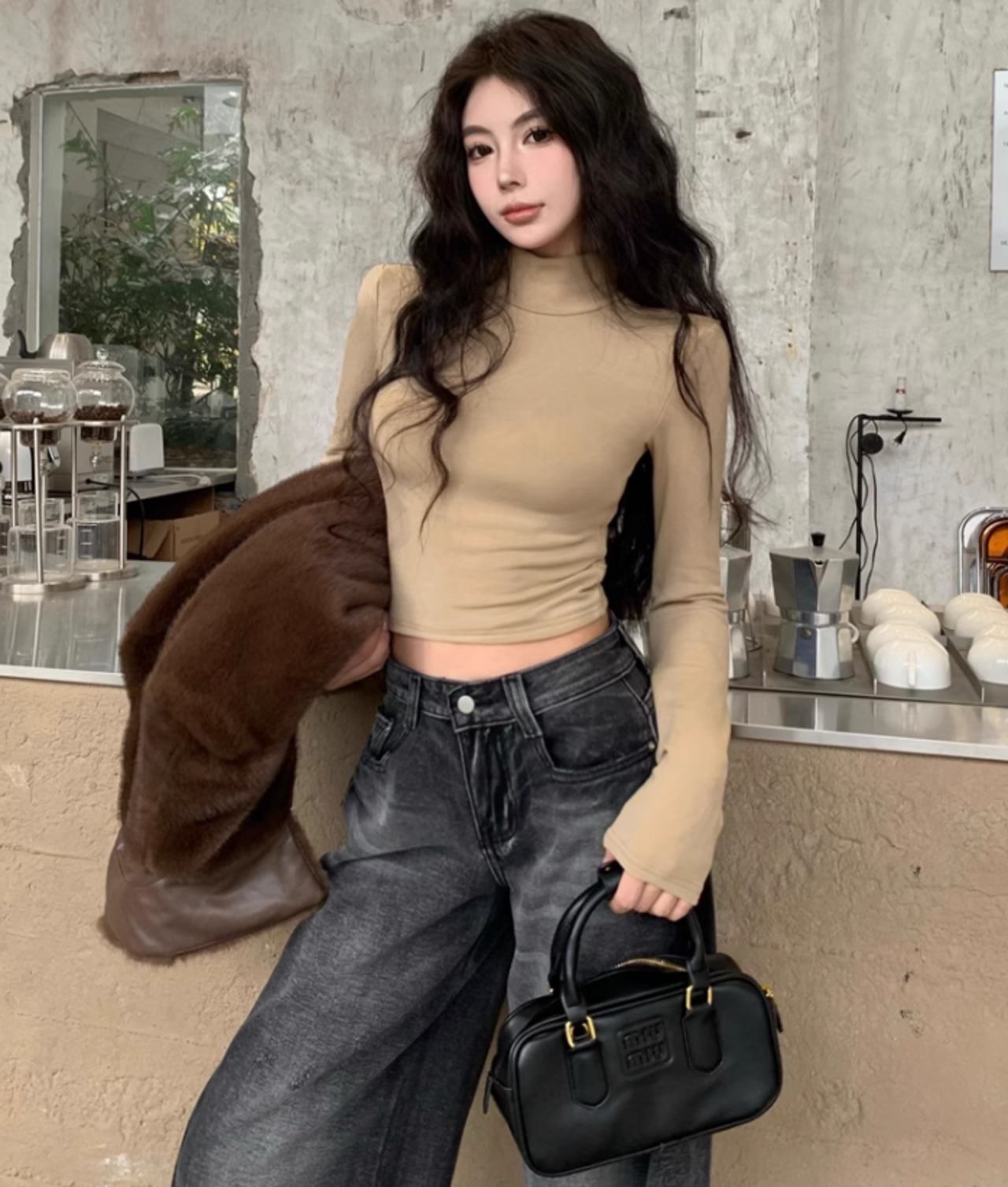 ロンT トップス プルオーバー 無地 レディース 秋冬 ストレッチ 長袖 バッククロス セクシー ハイネック ガーリー ベージュ ab2909