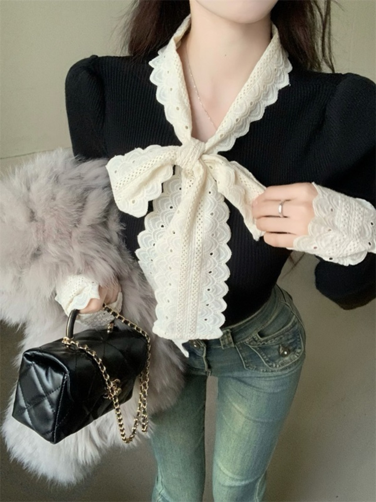 リボンタイ付きニット トップス レディース ニット セーター 長袖 リボンタイ レース スリム ガーリー キュート MH3895