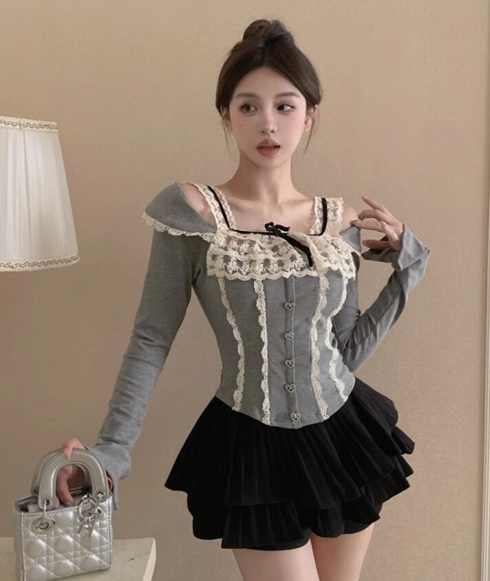 トップス プルオーバー レディース 秋冬 長袖 フェミニン フリル リボン 体型カバー スクエアネック ガーリー グレー ab2911