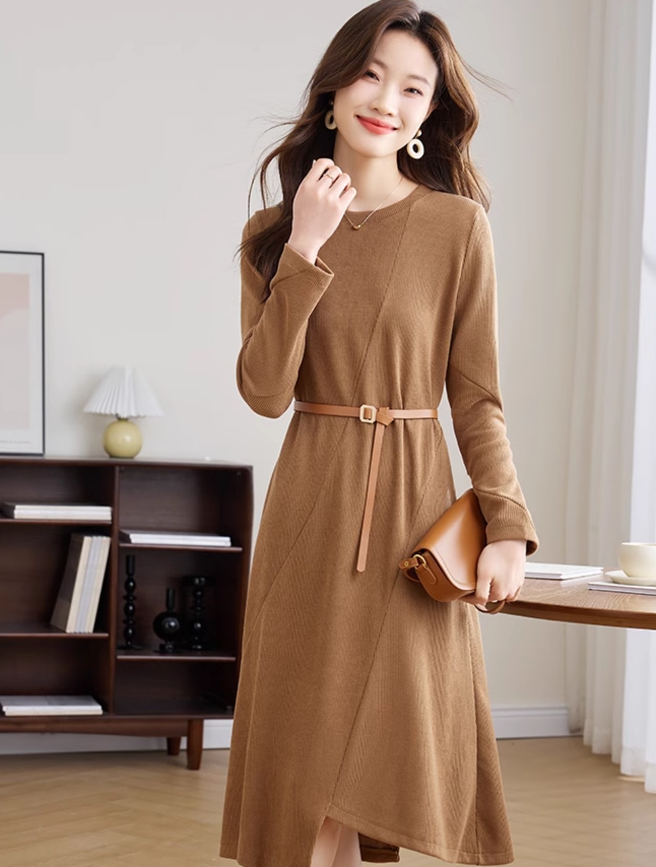 ワンピース レディース 秋冬 ひざ丈 無地 切り替え アシンメトリー ラウンドネック 長袖 ベルト ナチュラル オフィス ブラウン ab2925
