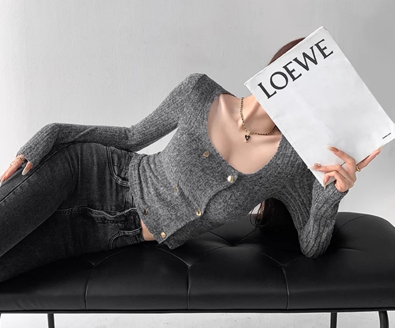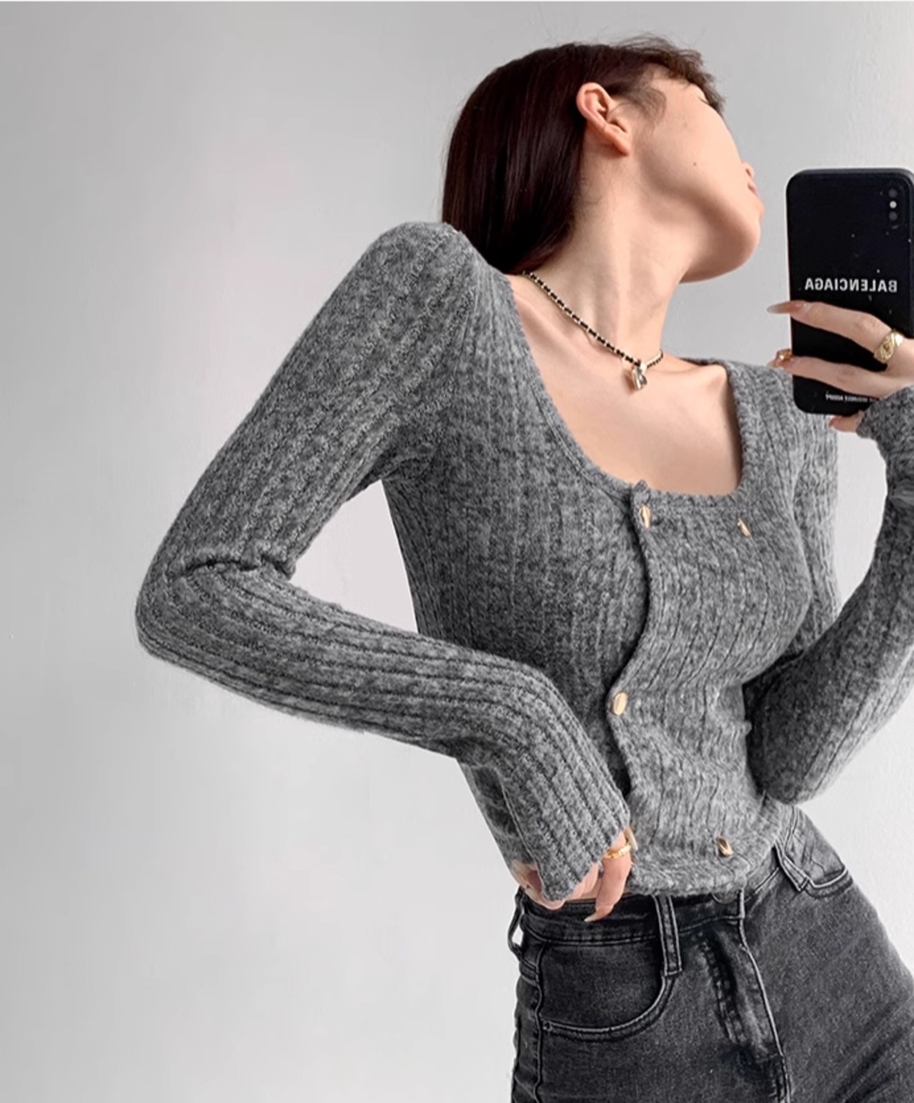 ニット レディース トップス 秋冬 スクエアネック ショート丈 長袖 ボーダー ボタン カーディガン セーター ガーリー グレー ab2926