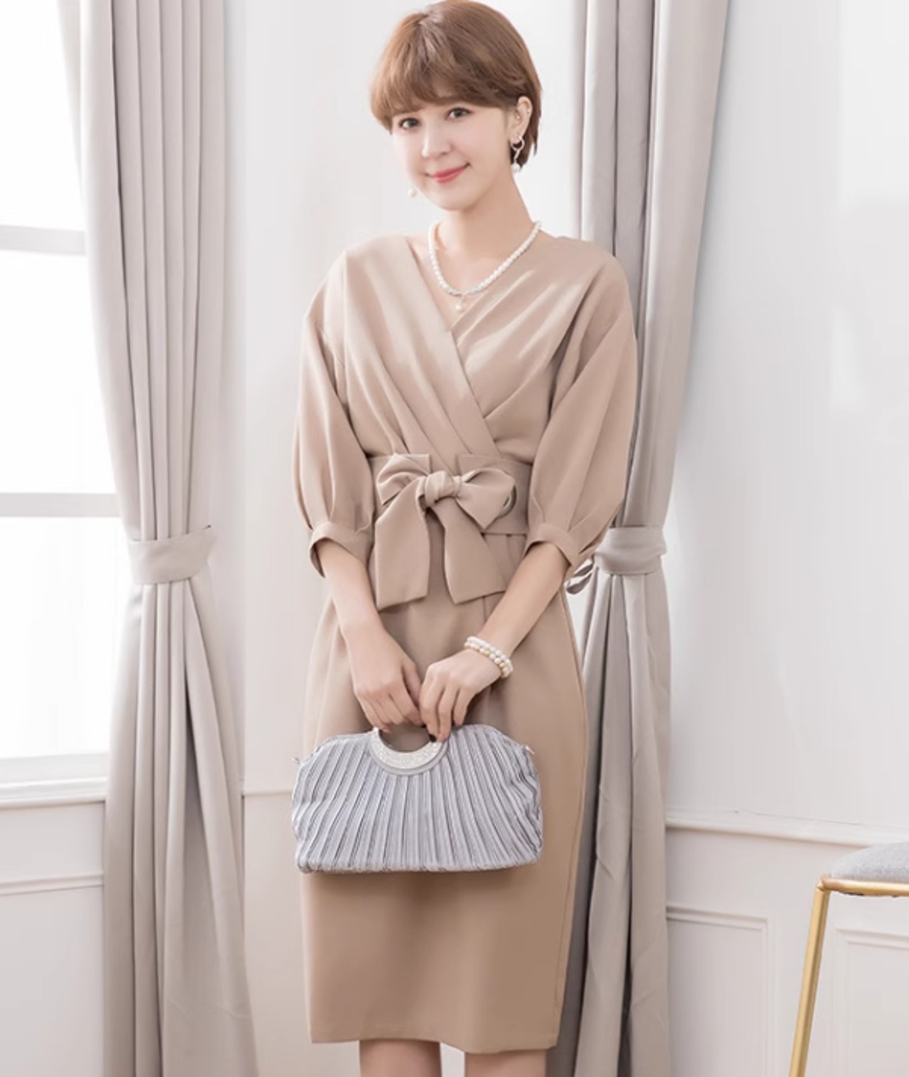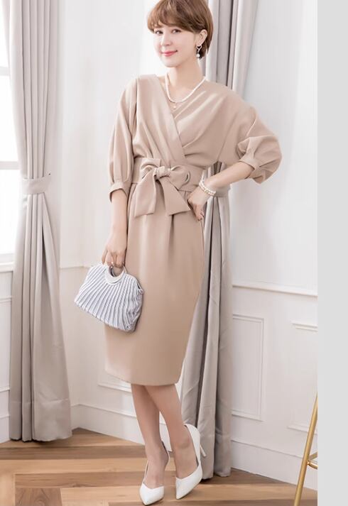 ドレス ワンピースドレス Vネック レディース フォーマル 無地 リボン お呼ばれ パーティー 結婚式 二次会 五分袖 オフィス ベージュ ab2958
