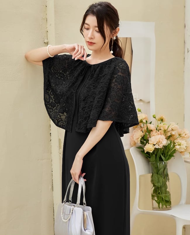 ドレス ワンピースドレス ツーピース レディース ケープ レース ノースリーブ ひざ丈 パーティー 結婚式 エレガント お呼ばれ 二次会 ブラック ab2964
