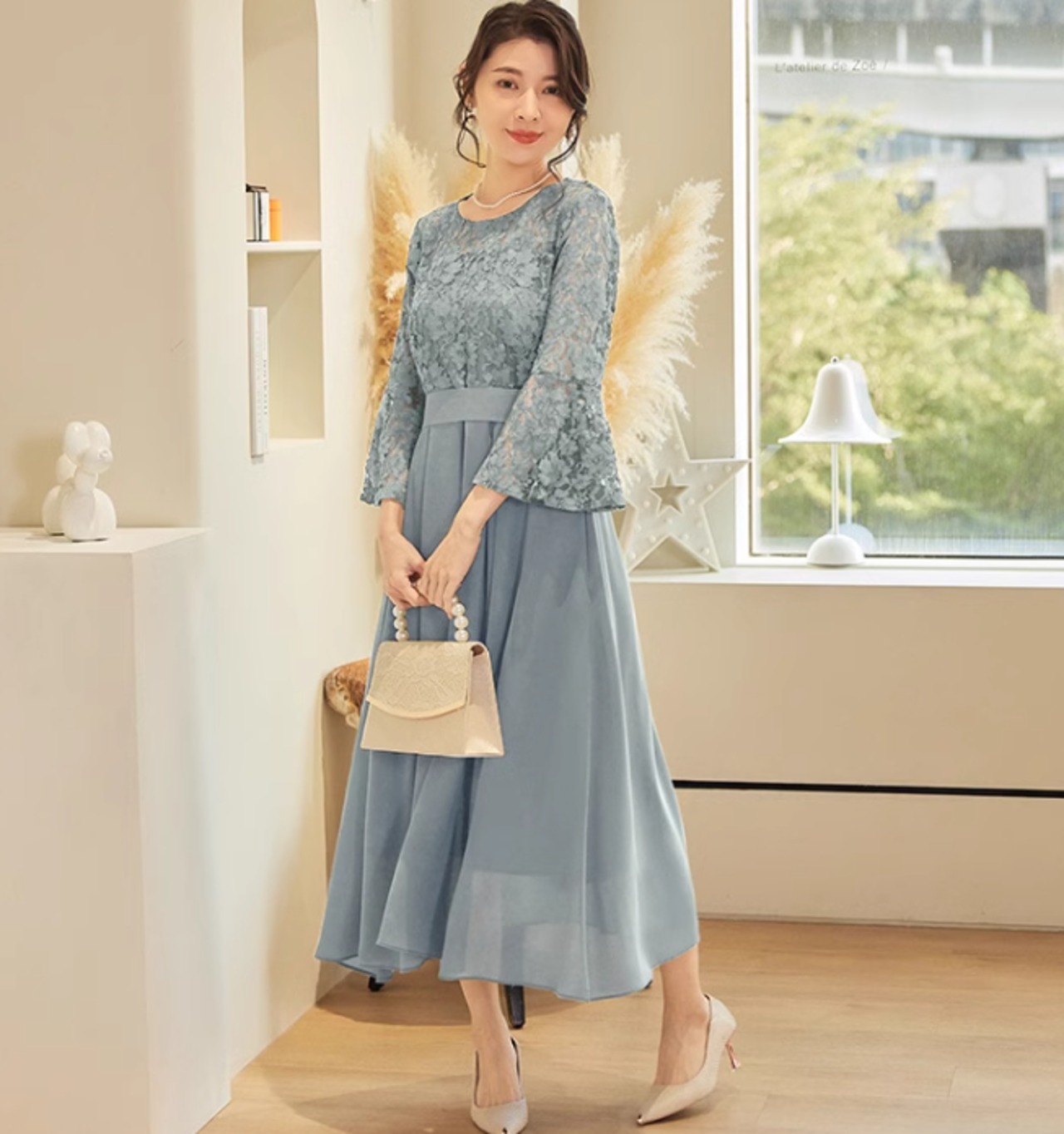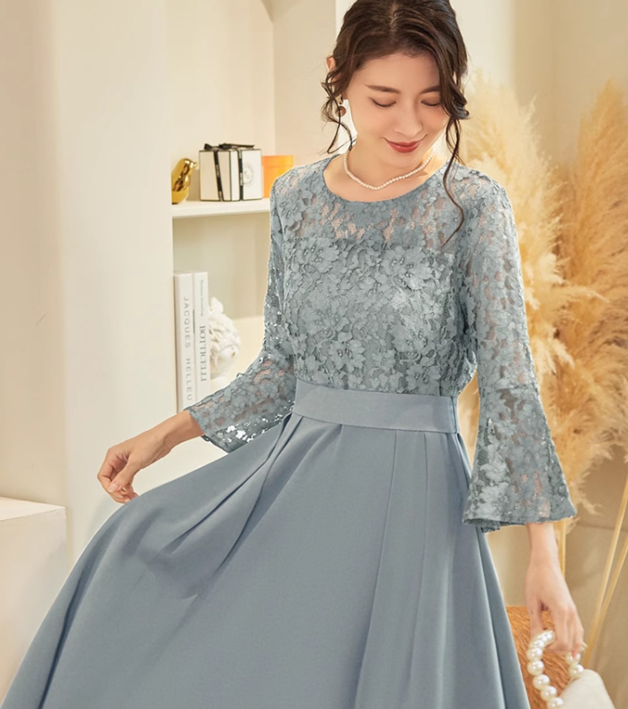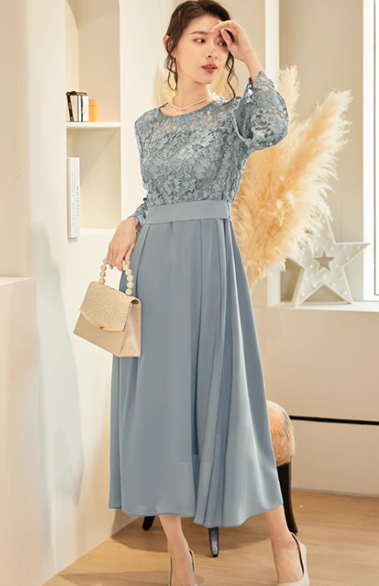ワンピースドレス ワンピース ドレス レースワンピ レース レディース ミモレ丈 七分袖 結婚式 二次会 パーティー お呼ばれ ラウンドネック ブルー ab2968