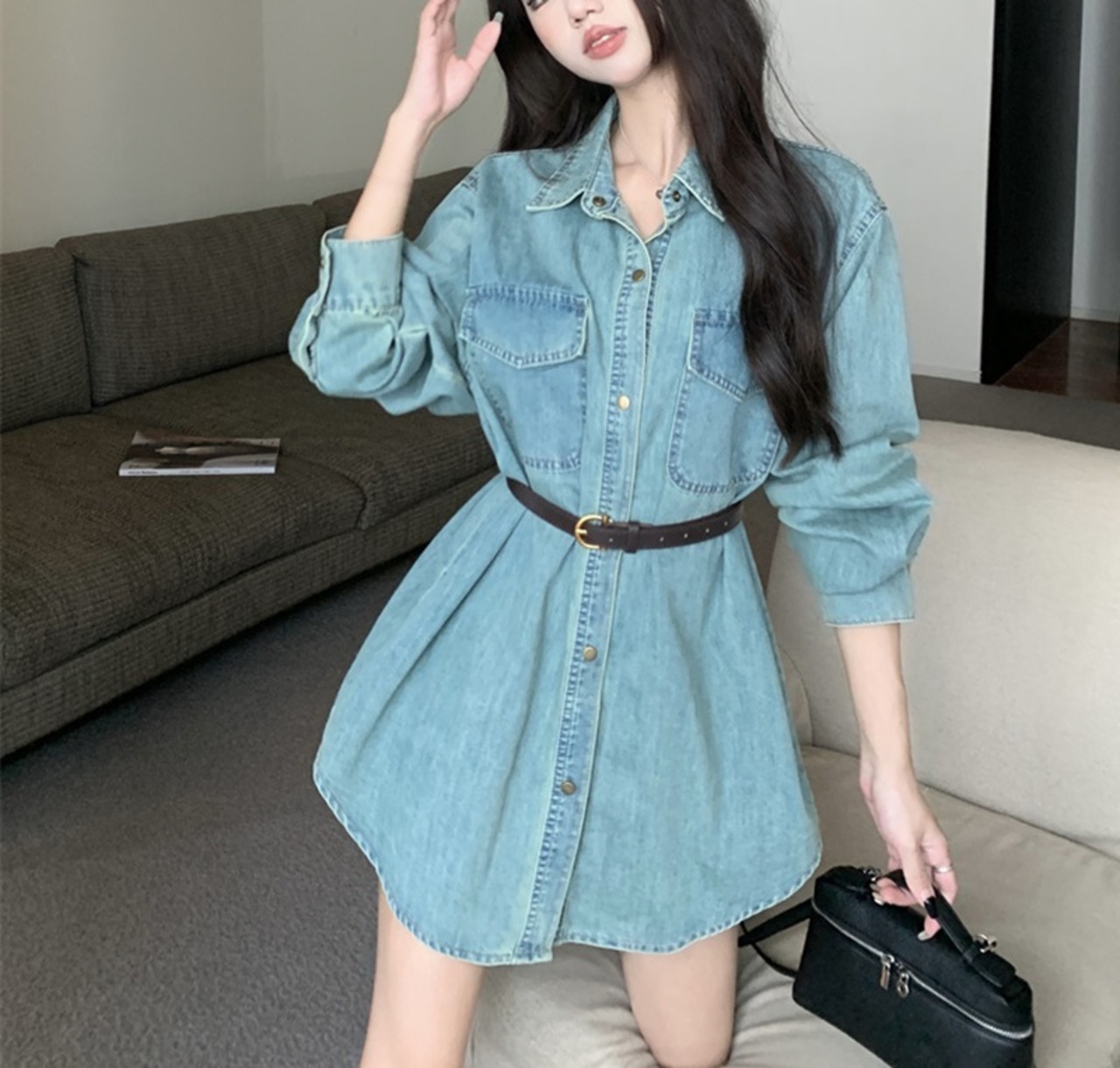 デニムシャツ トップス レディース デニム 長袖 ベルト付き レトロ カジュアル 大人可愛い 春 デート MH3935