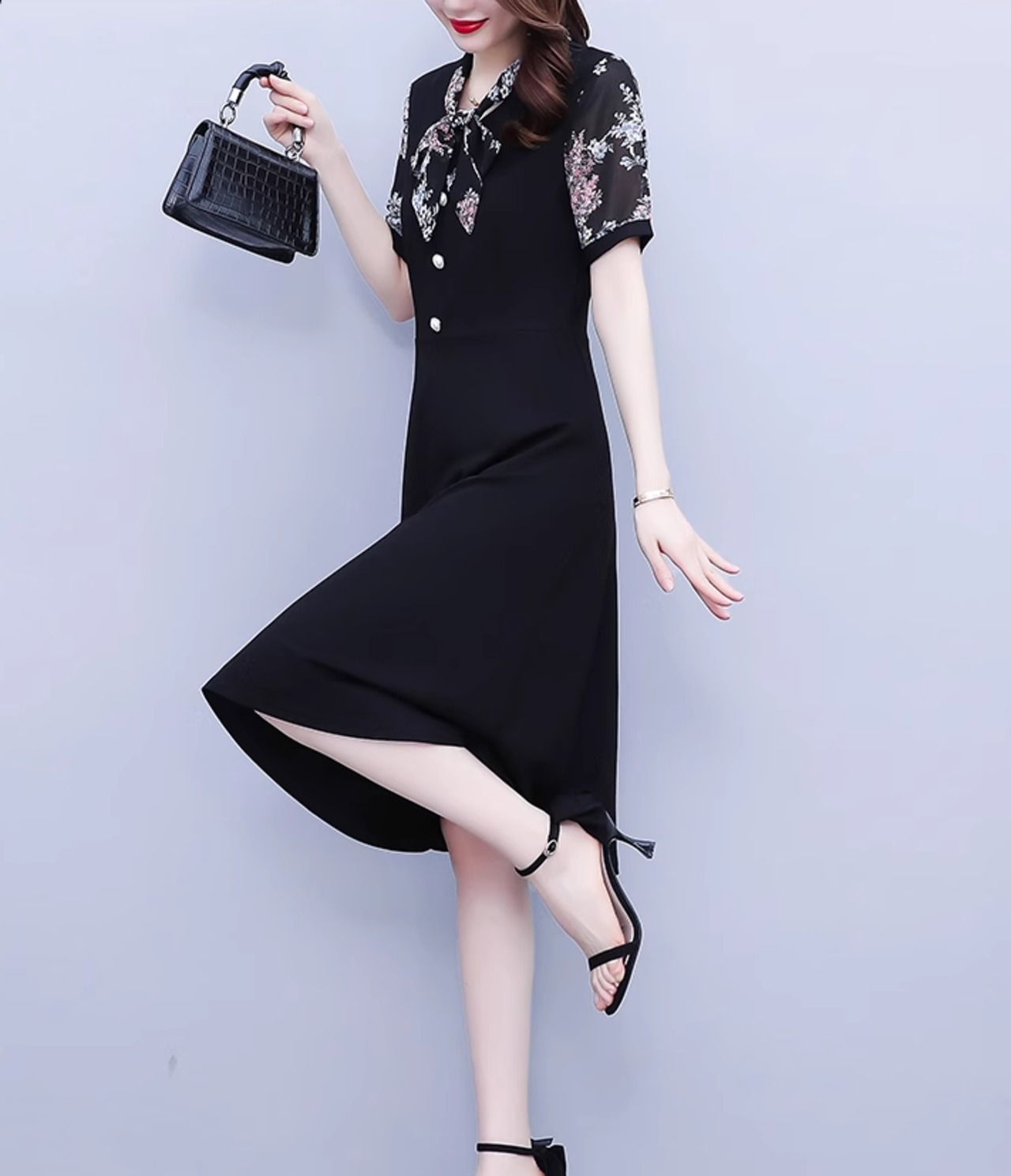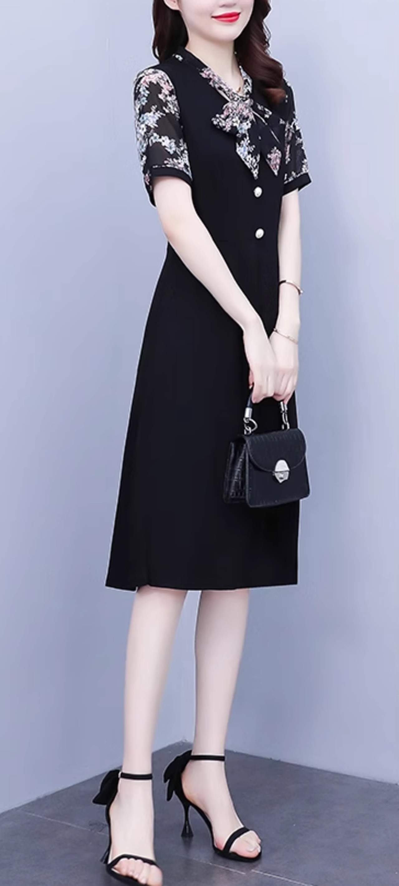 ワンピース レディース 春夏 ひざ丈 半袖 ドッキングワンピ 花柄 大きいサイズ リボン シック オフィス カジュアル ガーリー ab3038