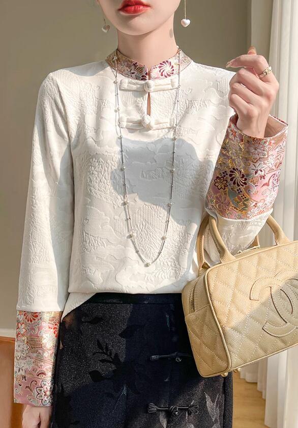 トップス プルオーバー レディース 春秋 大きいサイズ 長袖 チャイナ風 花柄 ハイネック レトロ エレガント オフィス プチプラ ホワイト ab3043