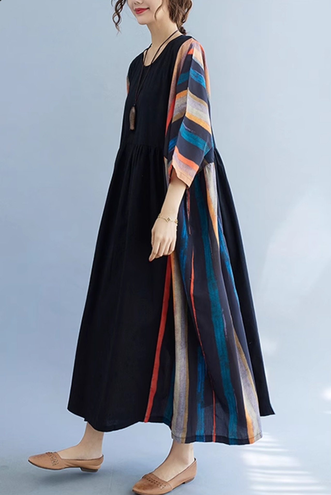ワンピース レディース 夏ワンピ ゆったり レトロ カジュアル ラウンドネック ストライプ ママコーデ 五分袖 プチプラ ab3069