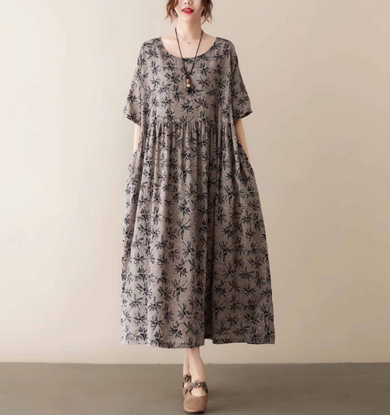 ワンピース レディース 春夏 ゆったり 花柄 半袖 ロング丈 レトロ ラウンドネック ガーリー カジュアル 体型カバー グレー ab3071