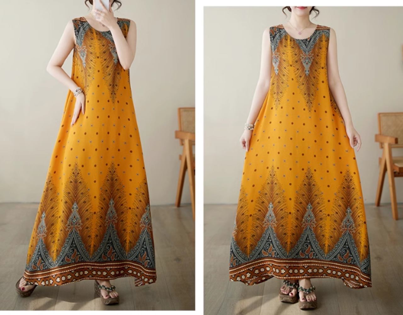 ワンピース 夏ワンピ レディース ロング丈 ノースリーブ エスニック リゾートワンピ リゾート 旅行 海 ビーチ ガーリー イエロー ab3076