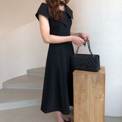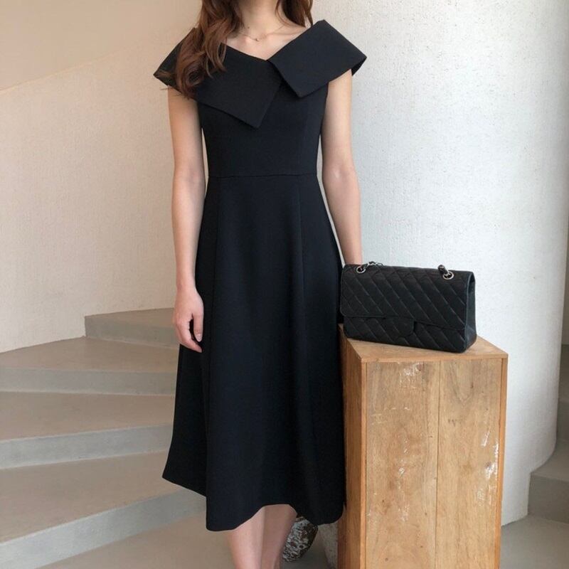 ワンピース レディース ノースリーブ 大きめの襟 襟付き シック Aライン きれいめ フォーマル お呼ばれ MH3971