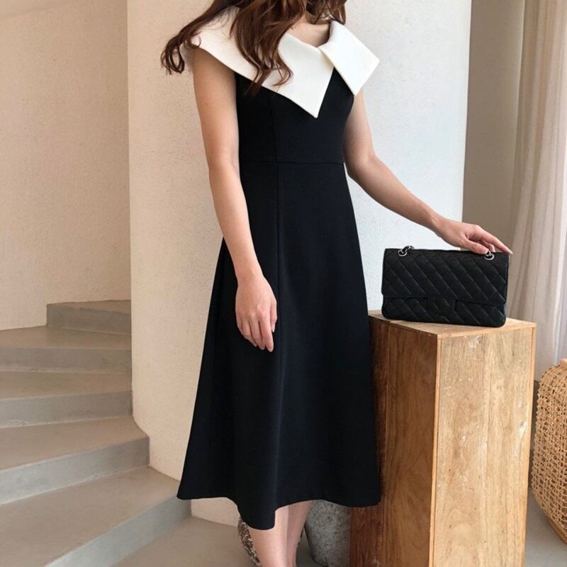 ワンピース レディース ノースリーブ 大きめの襟 襟付き シック Aライン きれいめ フォーマル お呼ばれ MH3972