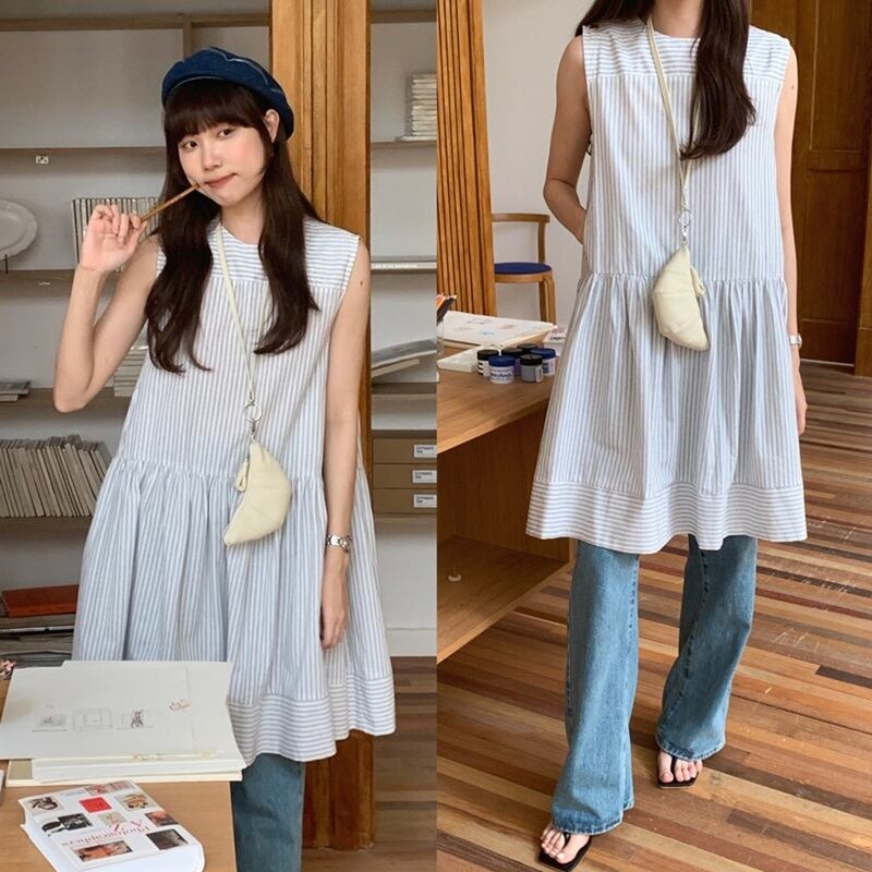 ワンピース レディース ミニ丈 ノースリーブ Aライン ラウンドネック ストライプ 細見え ガーリー キュート デート MH4019