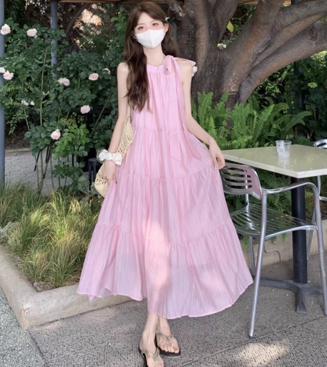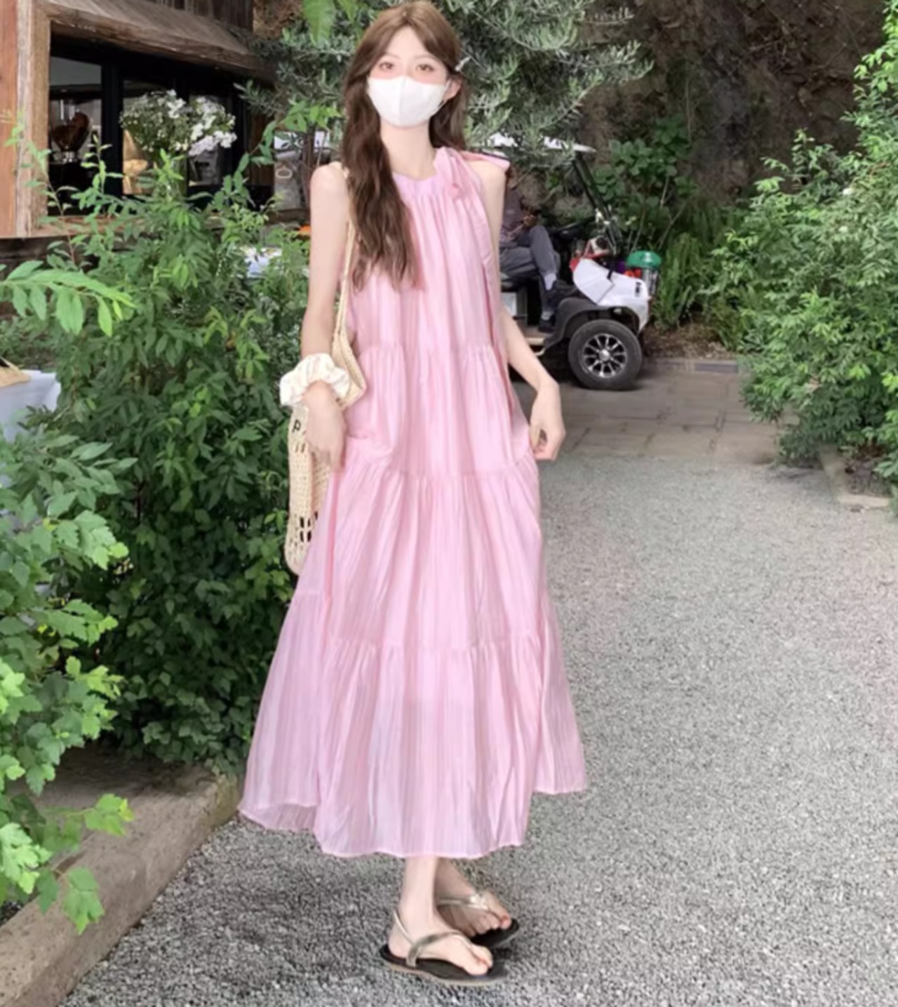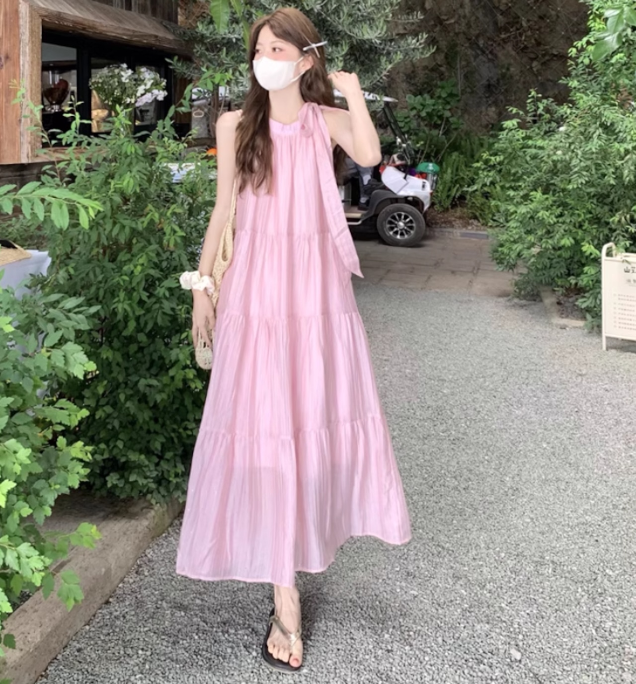 ワンピース ロング丈 サマーワンピ リゾートワンピ レディース ティアード ラウンドネック ノースリーブ ゆったり 旅行 ビーチ リボン ピンク ab3117