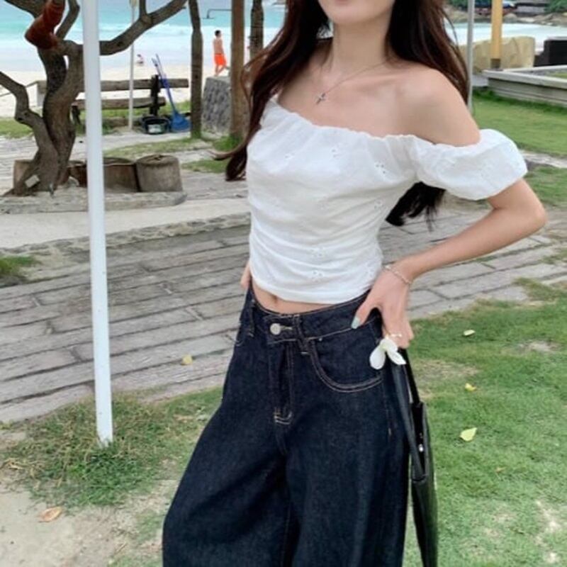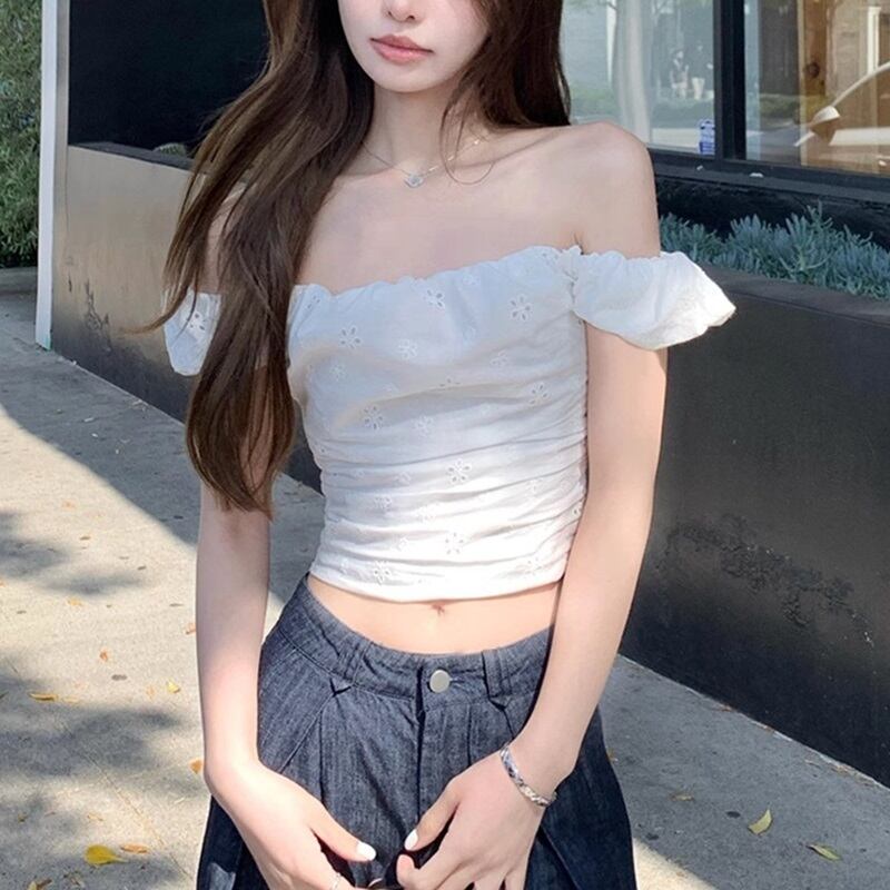 オフショルダー トップス レディース オフショル 肩出し ショート丈 花刺繍 ホワイト ガーリー 夏 可愛い デート MH4081