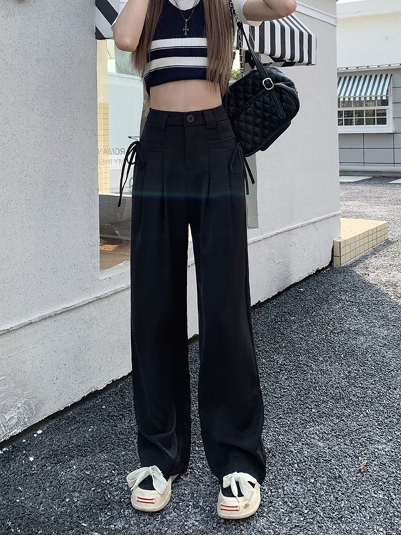 パンツ レディース ロング丈 ロングパンツ ワイド リボン ハイウエスト 脚長効果 美脚 無地 秋 おしゃれ MH4112