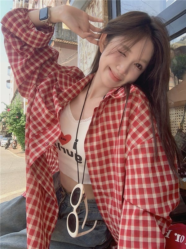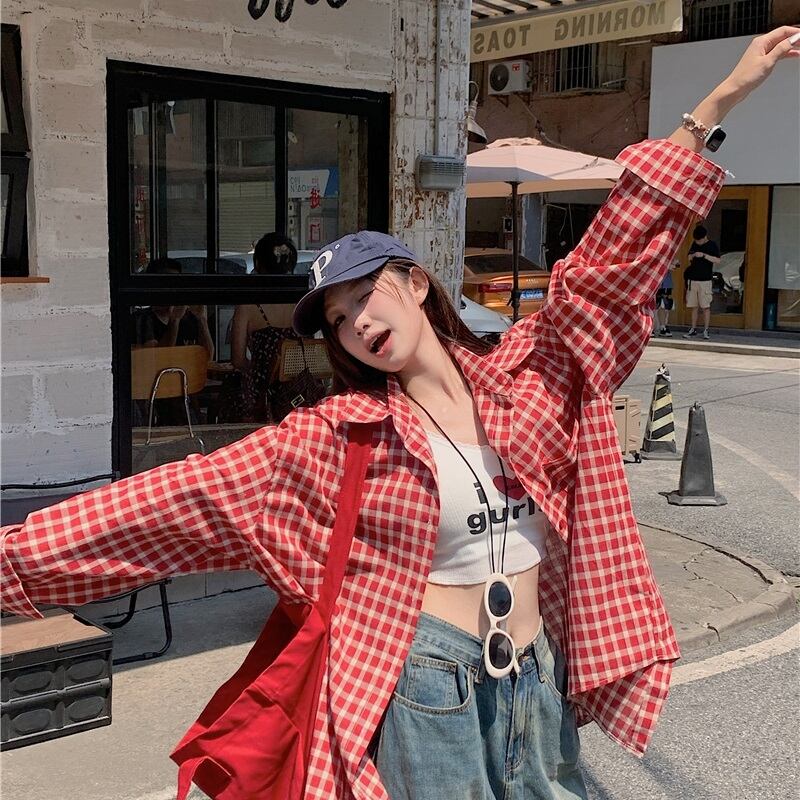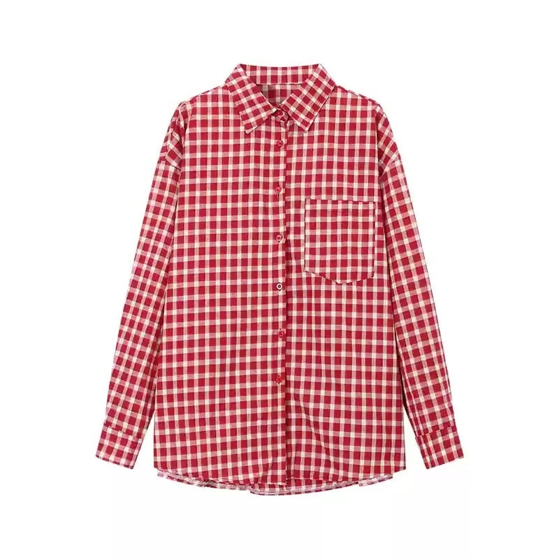 シャツ トップス レディース 長袖 レッド チェック柄 レトロ 日よけ ポロカラー 秋 ゆったり 体型カバー カジュアル MH4118