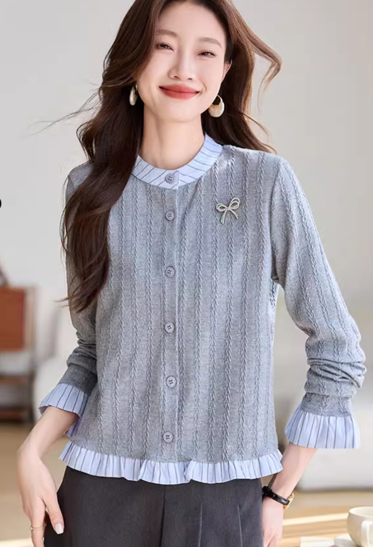 ニット レディース トップス カーディガン フェイクツーピース シャツ 長袖 ボーダー リボン 春秋 オフィス ラウンドネック ab3172