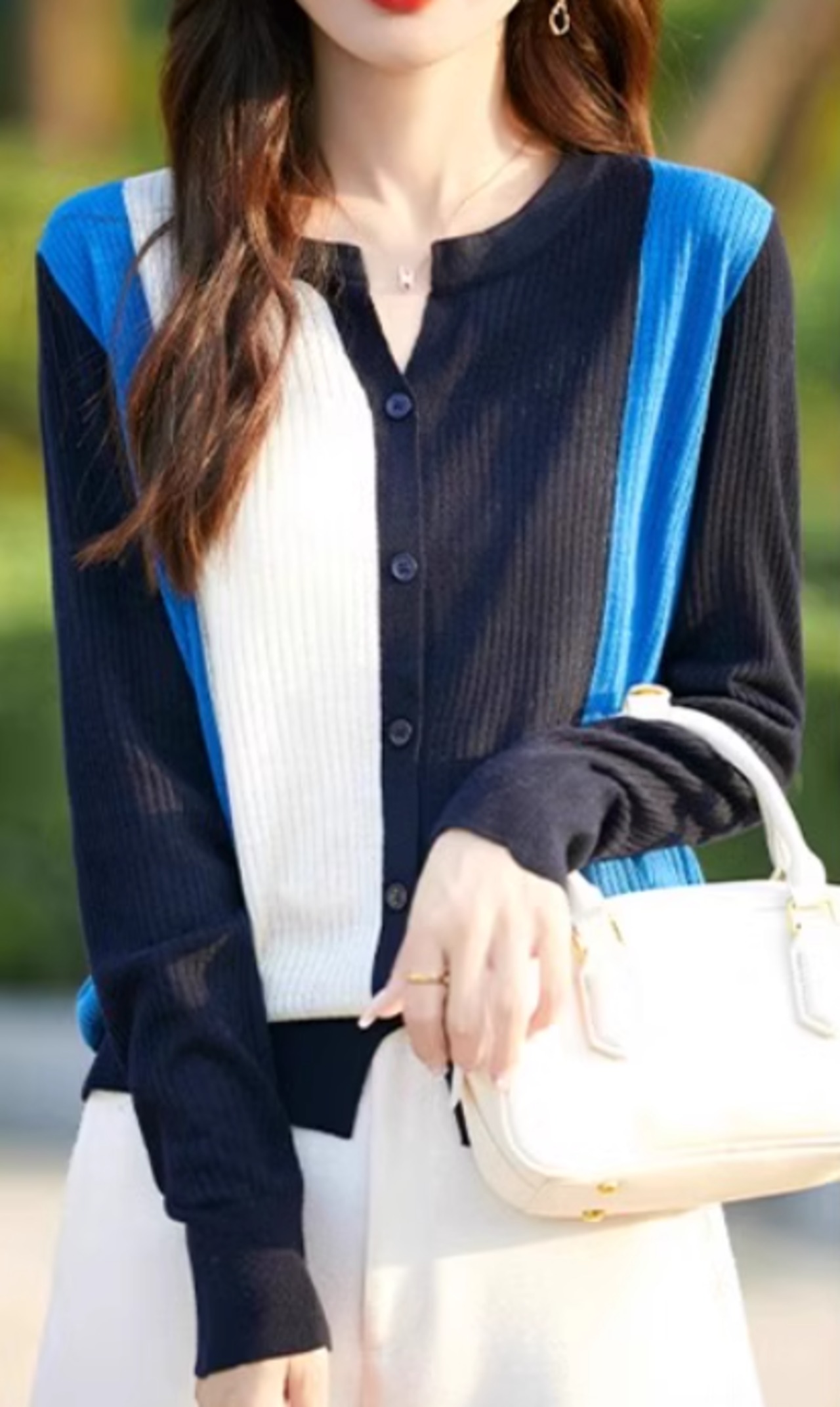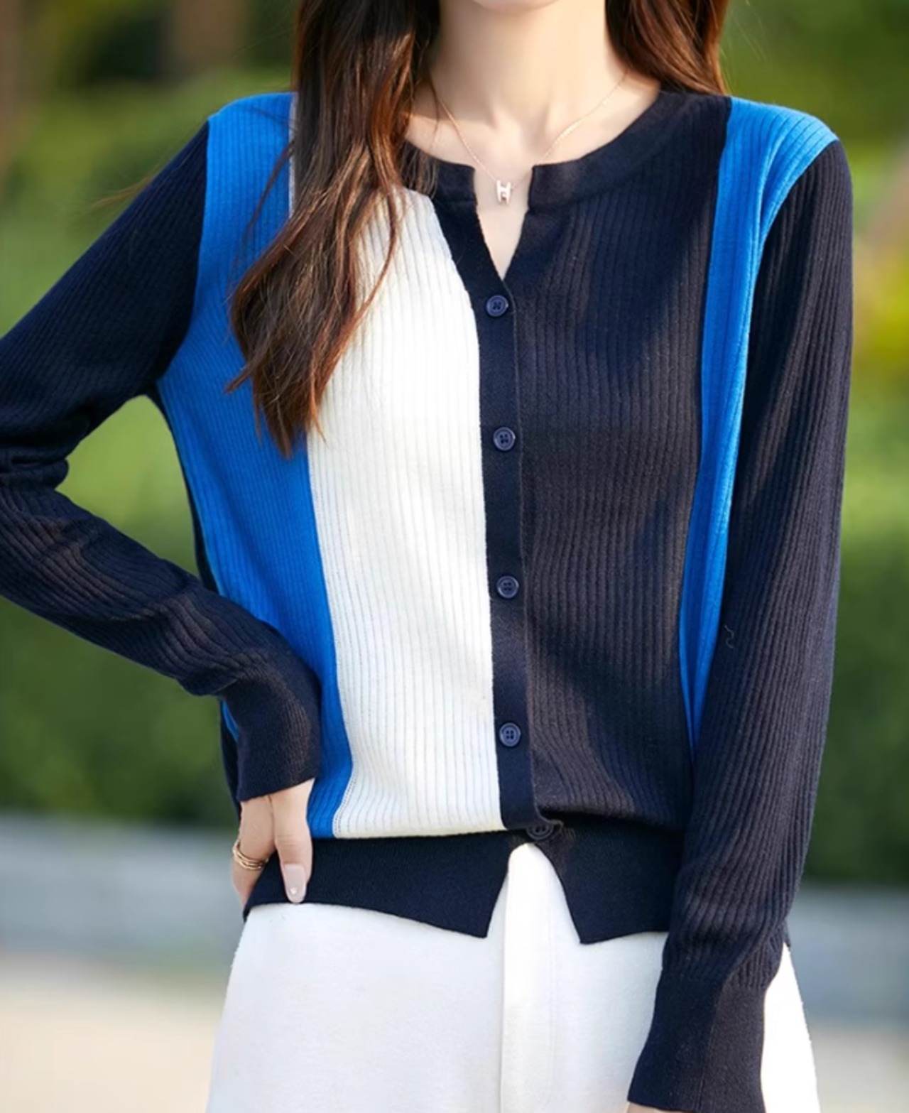 カーディガン ニット プルオーバー ラウンドネック 秋冬 レディース 長袖 トリコロール ボーダー ストライプ カジュアル オフィス ブルー ab3194