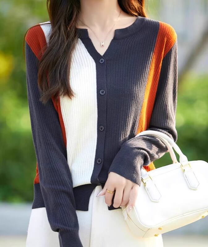 カーディガン ニット プルオーバー ラウンドネック 秋冬 レディース 長袖 トリコロール ボーダー ストライプ カジュアル オフィス ブラウン ab3195