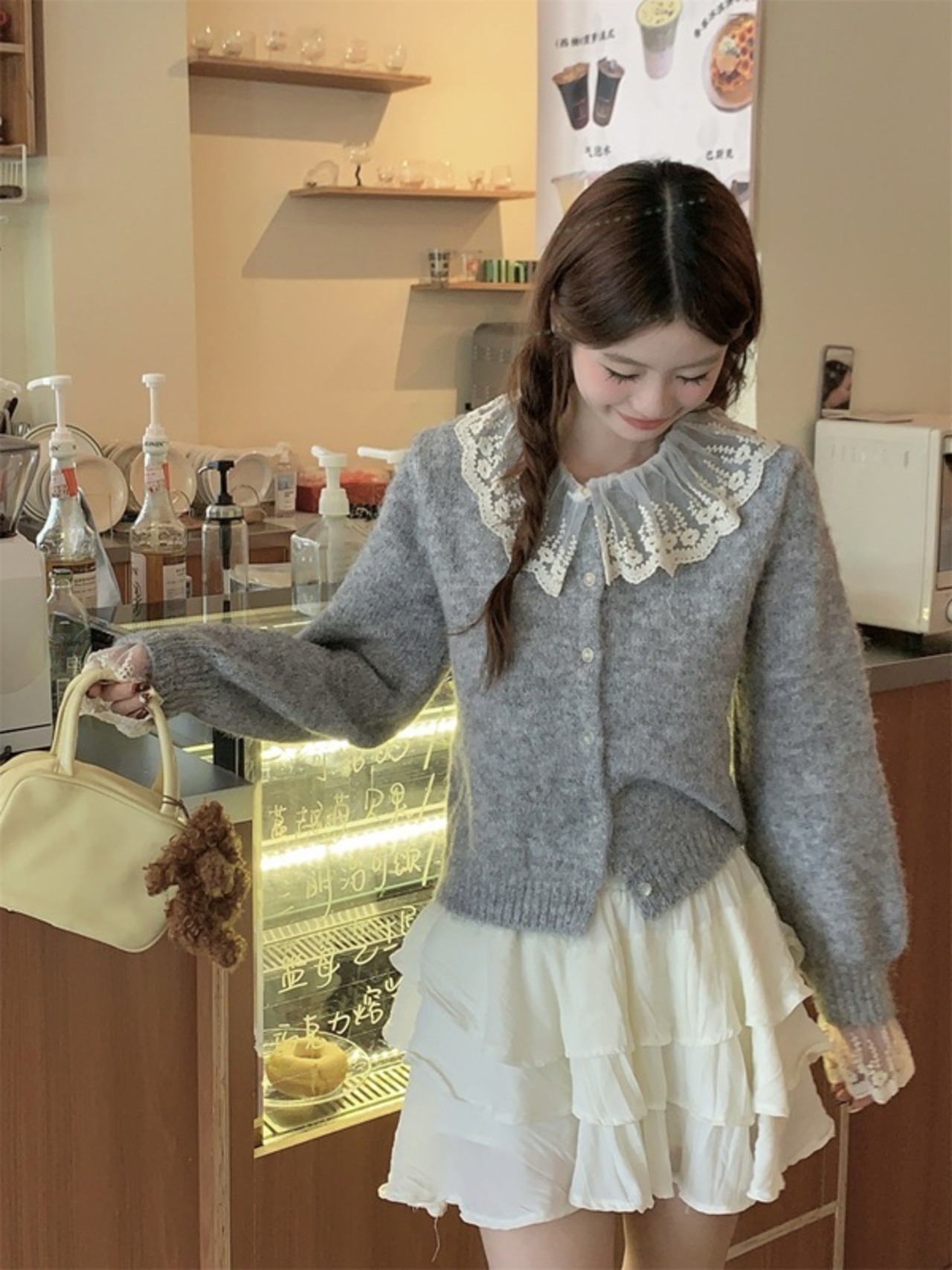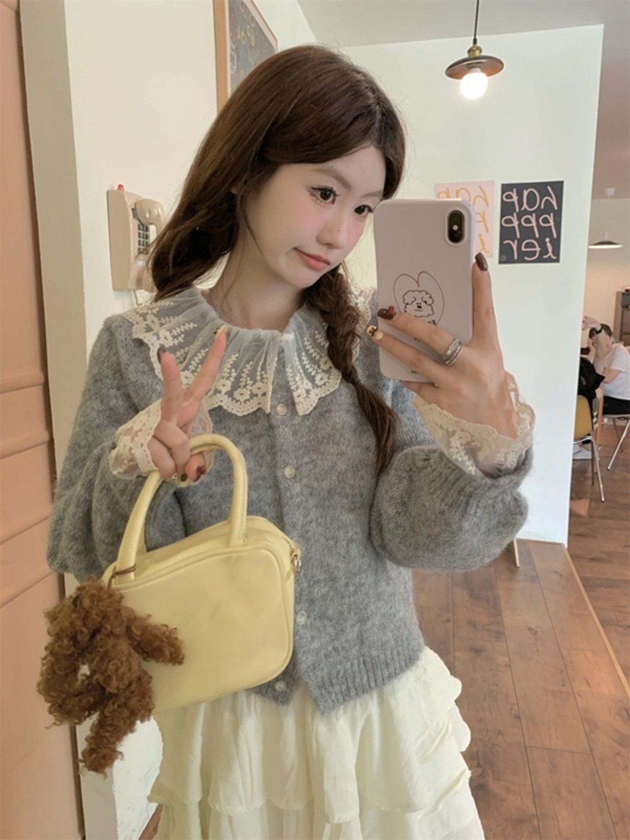 トップス レディース セーター 長袖 ラウンドネック レース 秋 冬 パステルカラー ガーリー フェミニン デート お出かけ MH4244