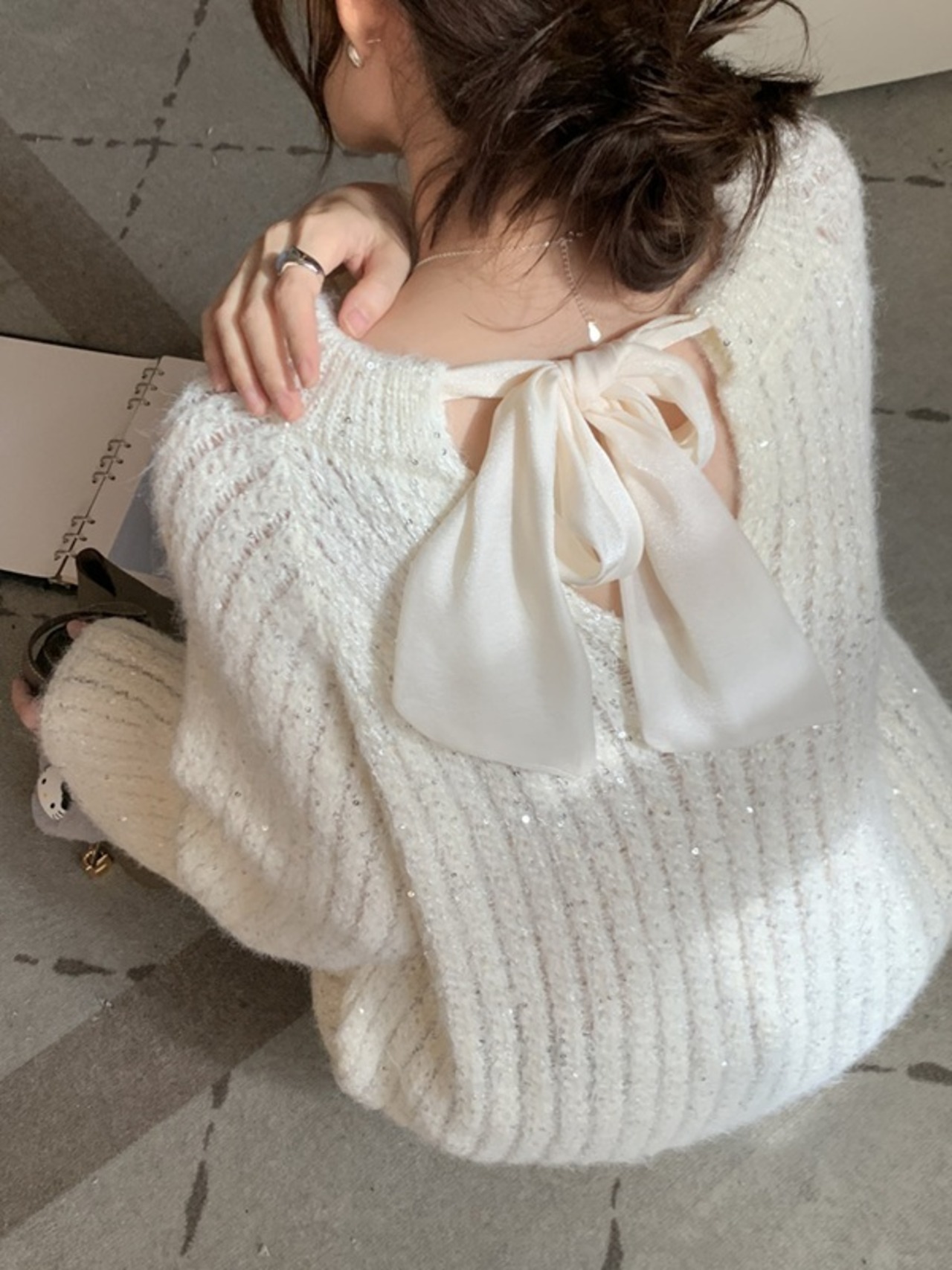 トップス レディース ニット セーター 長袖 バックリボン リボン ゆったり ゆるり 秋 冬 カジュアル ガーリー 韓国 MH4311