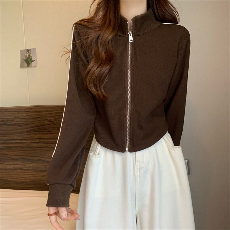 トップス レディース ハイネック ライン入り スリム ジップ ショート丈 スタンド ネック 羽織 ジャージ カジュアル MH4322