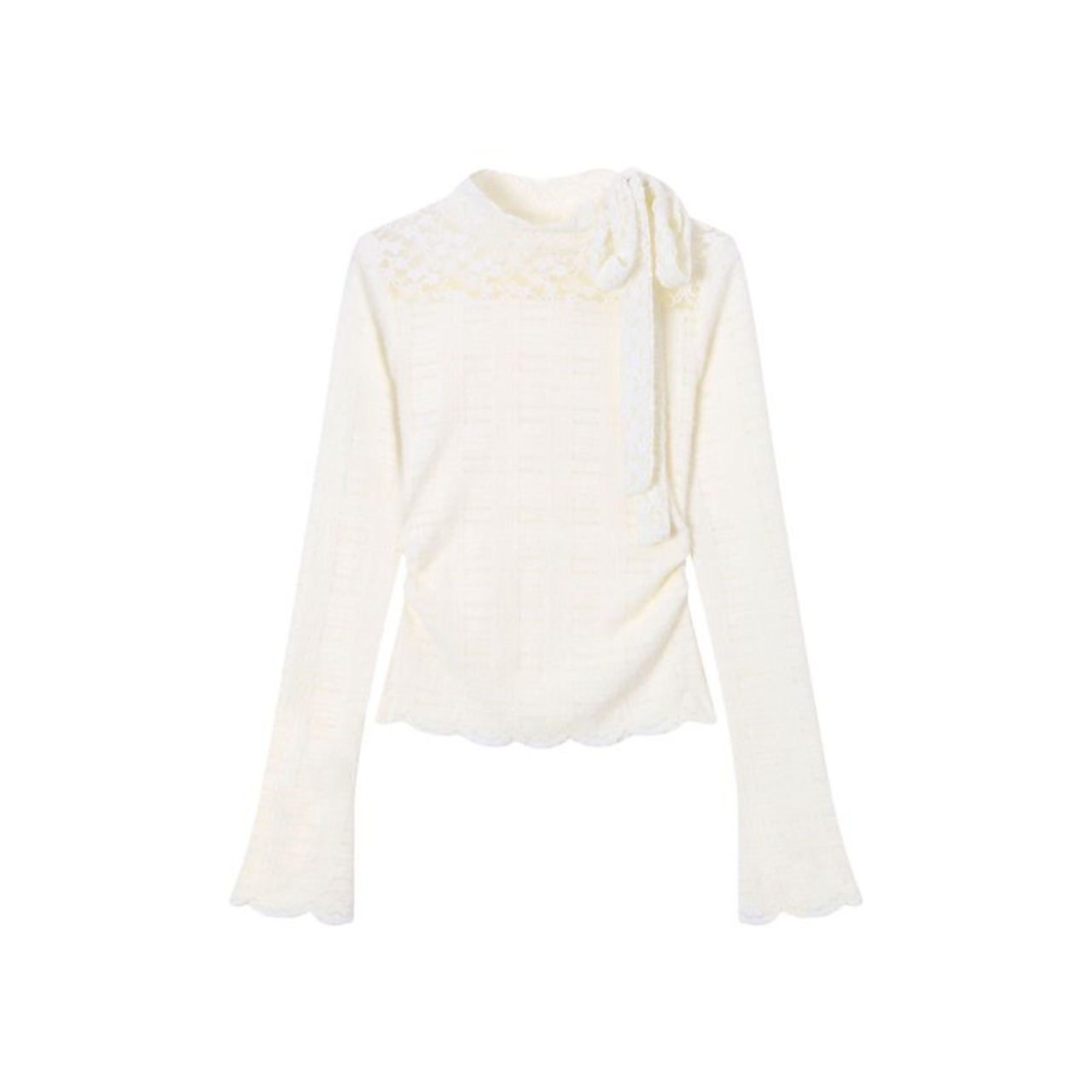 トップス レディース ハーフネック 長袖 レース かぎ編み リボンタイ フィット感 シンプル きれいめ 通勤 オフィス MH4344