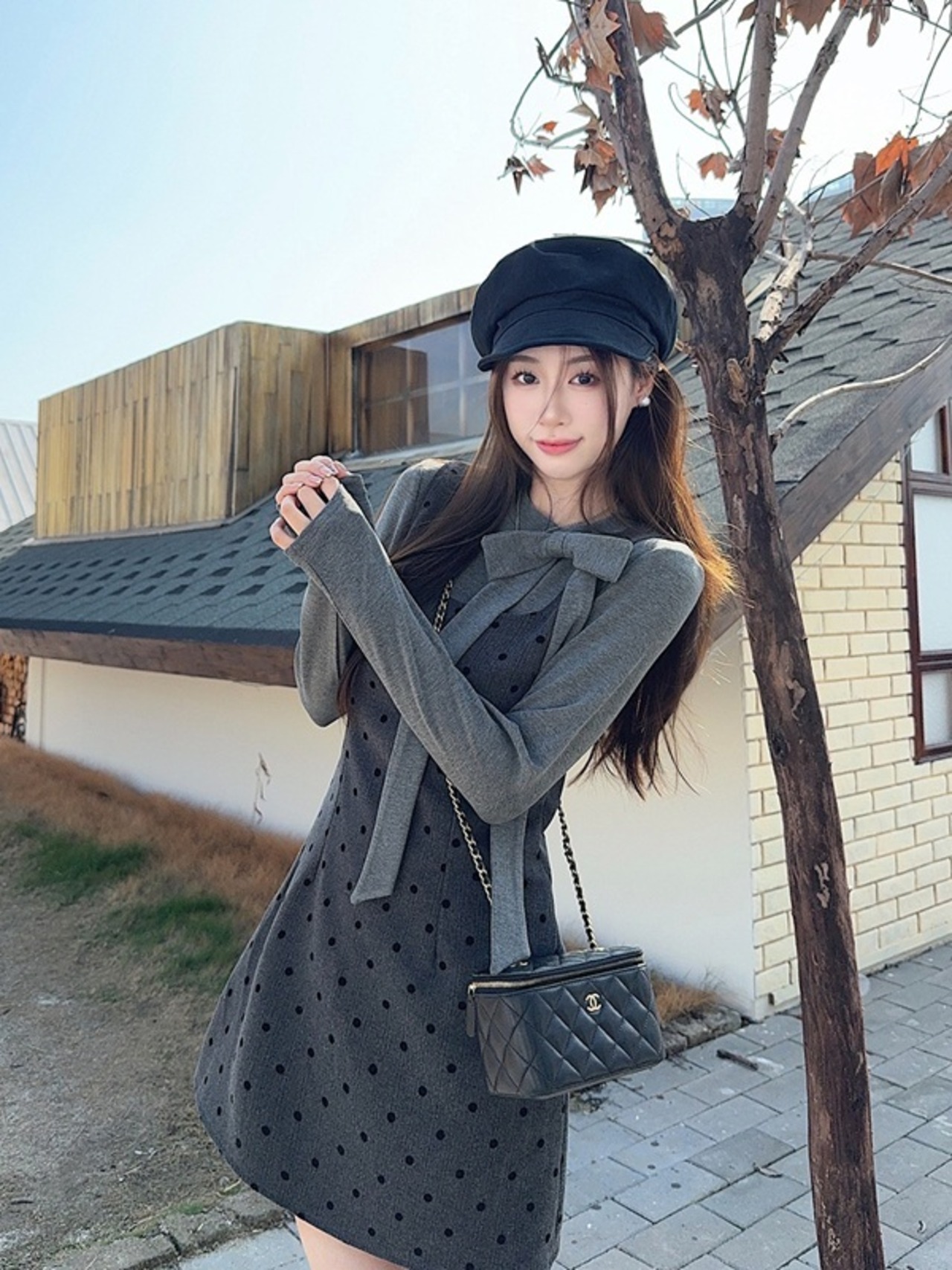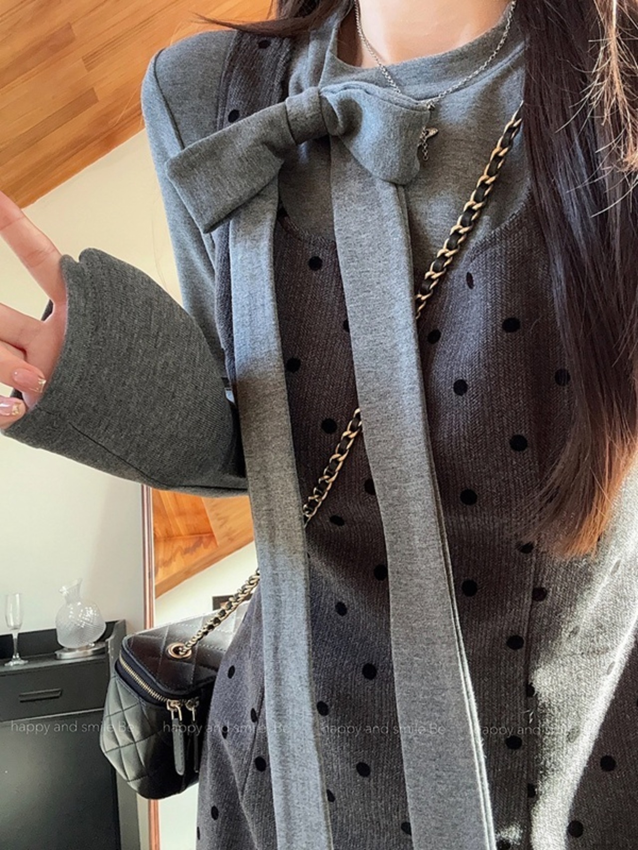 トップス レディース 長袖 リボン付き カットソーグレー 無地 キュート ガーリー カジュアル 可愛い デート MH4381